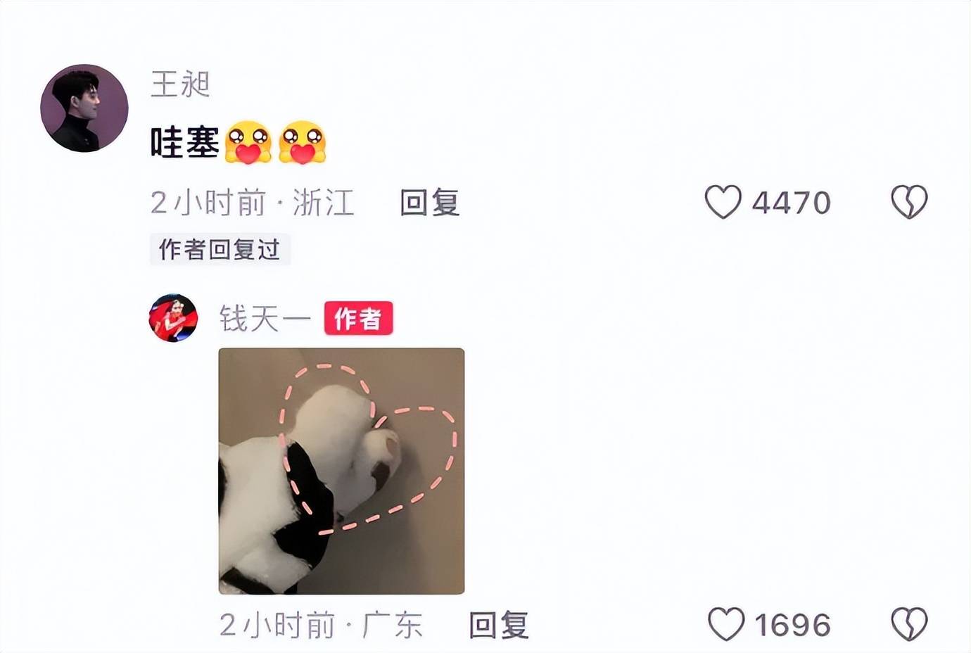 钱天一没有做出过多回应,只是发了一个可爱的“心形”表情——小猫咪爪子做出的心形动作。这个表情显然是在回应王昶的“示爱”,意思很明确——“爱你”。看得出来,这种直接的互动已经告诉大家,二人确实有着特殊的关系。网友们看到他们如此甜蜜的互动,纷纷表示“甜到炸裂”。