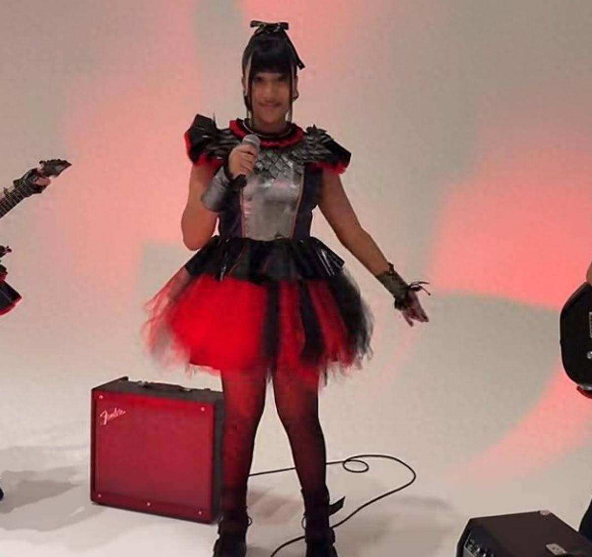 就在假纹身的争议尚未平息时,诺斯的万圣节造型又一次让她成为舆论的焦点。这次,她没有选择传统的装扮,而是与两位朋友一起cosplay了日本的重金属乐队BABYMETAL。你可能对这个乐队不太熟悉,他们的风格将“少女偶像”和“重金属”融合,舞台造型既前卫又张扬。诺斯和她的朋友们精准地复刻了乐队的黑色前卫连衣裙,站在临时搭建的舞台上,唱歌跳舞,气场丝毫不输专业艺人。背景音乐也是BABYMETAL的经典作品。她们轮流担任主唱,甚至拿起道具吉他扮演乐手,舞台上的表现力不容小觑。