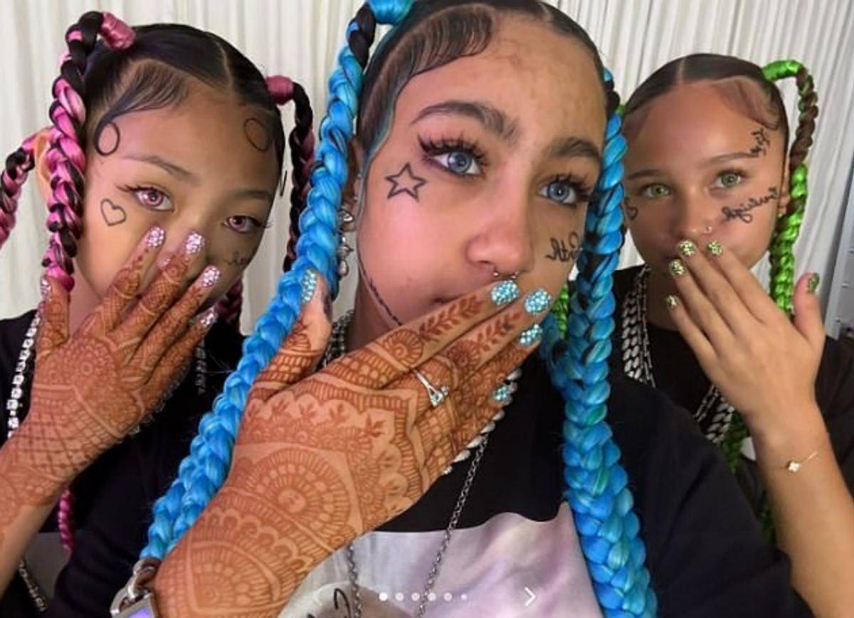 说实话,12岁的孩子通常是什么模样?是不是应该扎着马尾穿着校服,或者模仿动漫角色打扮成可爱模样?然而,诺斯显然不按常理出牌。前不久,她在自己的社交账号上发布了一段视频,完全颠覆了大众对她年龄的认知。视频中的她,一头蓝色长发垂至腰际,眼睛戴着蓝色美瞳,眼神犀利;牙齿上佩戴着黑色金属牙套,鼻子上还挂着假鼻环。最引人注目的是她脸上密密麻麻的假纹身,眼下方的星星闪闪发亮,脸颊上的花体文字显得格外醒目。她身穿一件黑色oversize T恤,搭配宽松短裤和厚底运动鞋,脖子上堆满了好几条银质项链,站在同样装扮的朋友中间,正对镜头做着热门音频的对口型表演。
