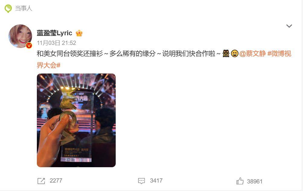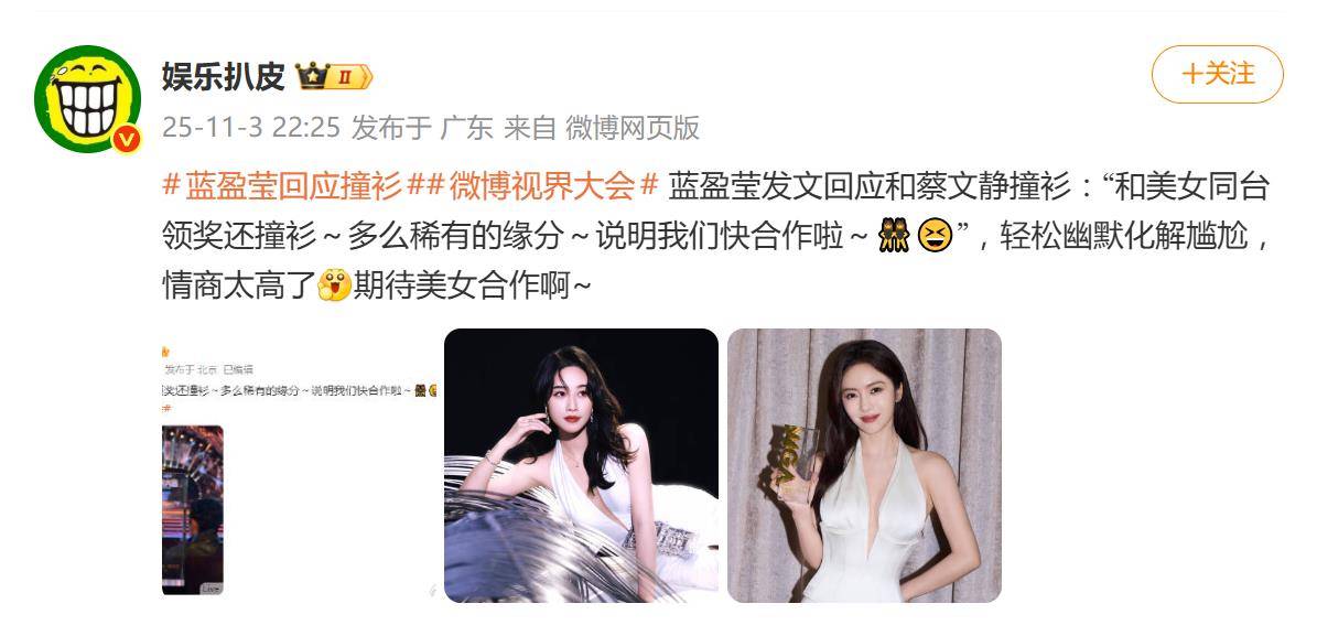 本以为这场意外会发展成一场“谁丑谁尴尬”的大戏,但蓝盈莹却以高情商化解了尴尬。在微博上,她主动发文调侃道:“和美女同台领奖还撞衫~多么稀有的缘分~说明我们快合作啦~”,并特别@了蔡文静。她这一举动立即引发了网友的赞赏,被视为“危机公关的典范”。关于蔡文静回应的传闻,原本有网友误传她说“我的正缘就是你”,但她后来澄清称自己实际的回应是“今晚美的很巧合”。两人默契十足地互动,将这场偶然的“撞衫”事件,转化成了一场轻松的互动。