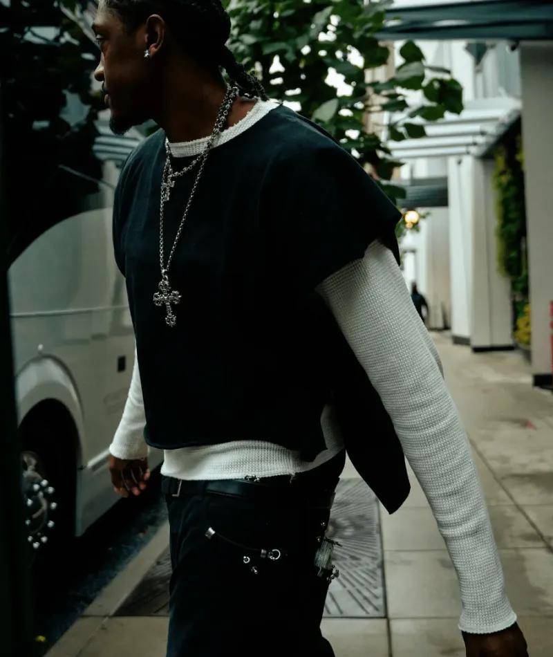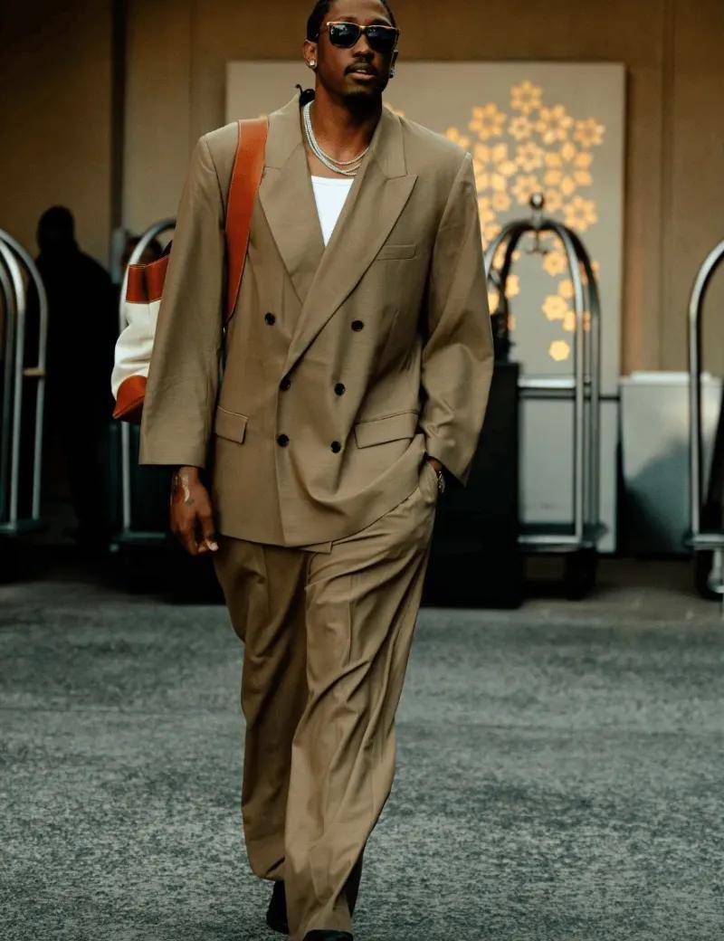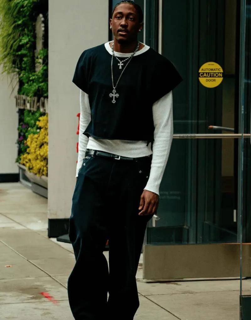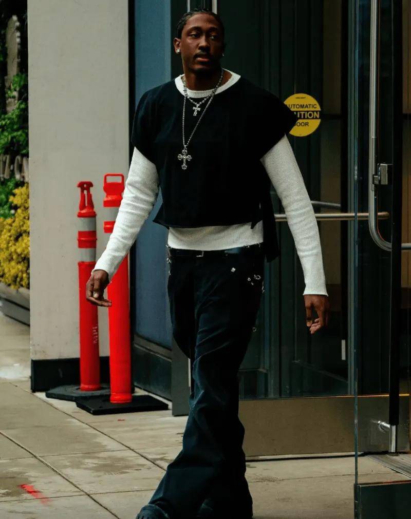 图集里的杰伦 - 威廉姆斯展现出了丰富多样的时尚风格。有一套是休闲的美式街头风,他身着宽松的连帽卫衣,卫衣上独特的涂鸦图案彰显着青春的不羁与个性,下身搭配一条破洞牛仔裤,裤边不规则的毛边设计增添了几分随性。脚蹬一双经典的白色运动鞋,鞋面上的彩色线条点缀又让整体造型不至于过于单调。另一套则偏向于精致的商务休闲风,一件剪裁合身的藏青色西装外套,内搭白色衬衫,系着一条简约的蓝色领带,下身搭配黑色西裤和棕色皮鞋,整个人看起来成熟稳重又不失时尚感。