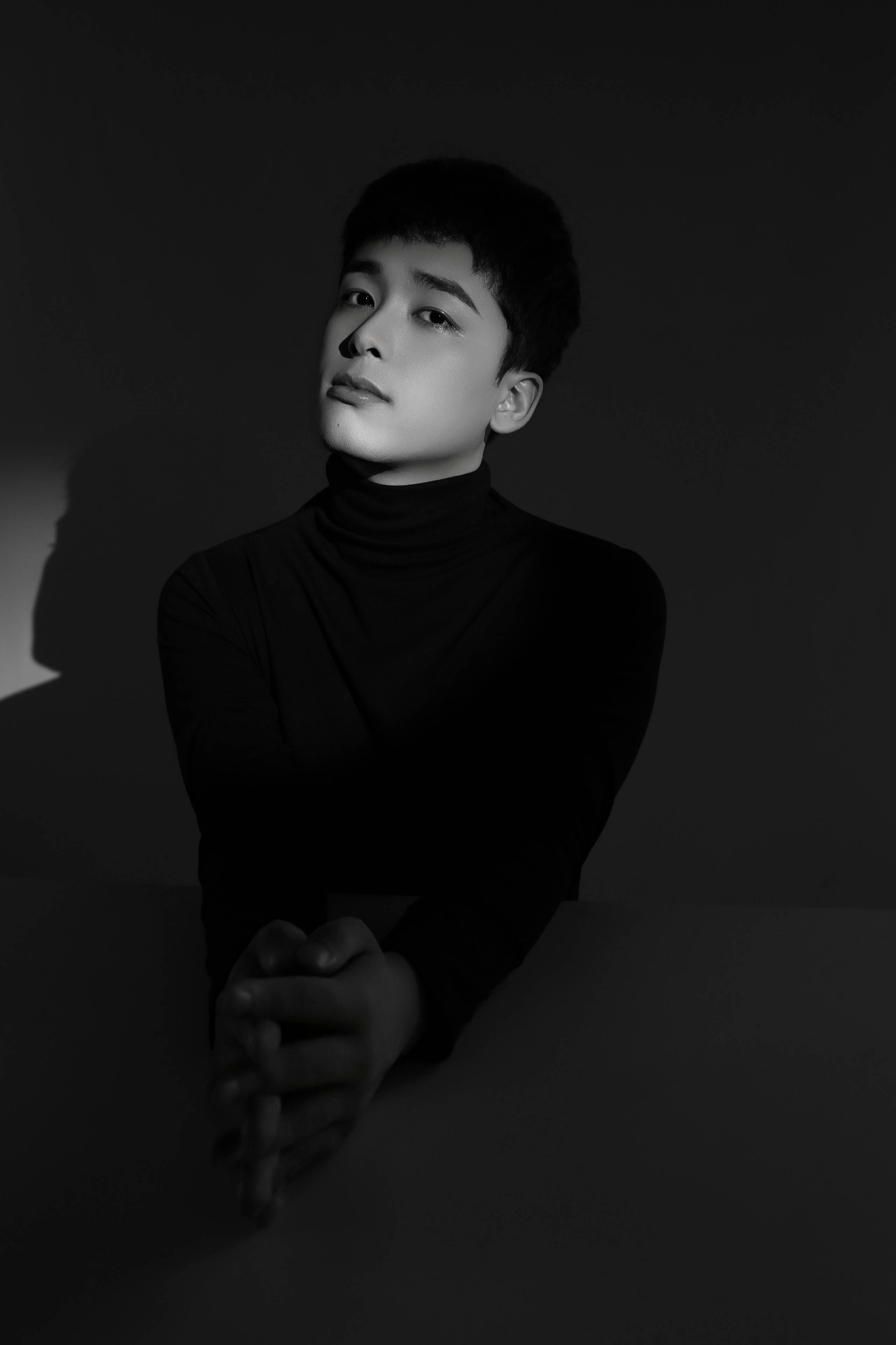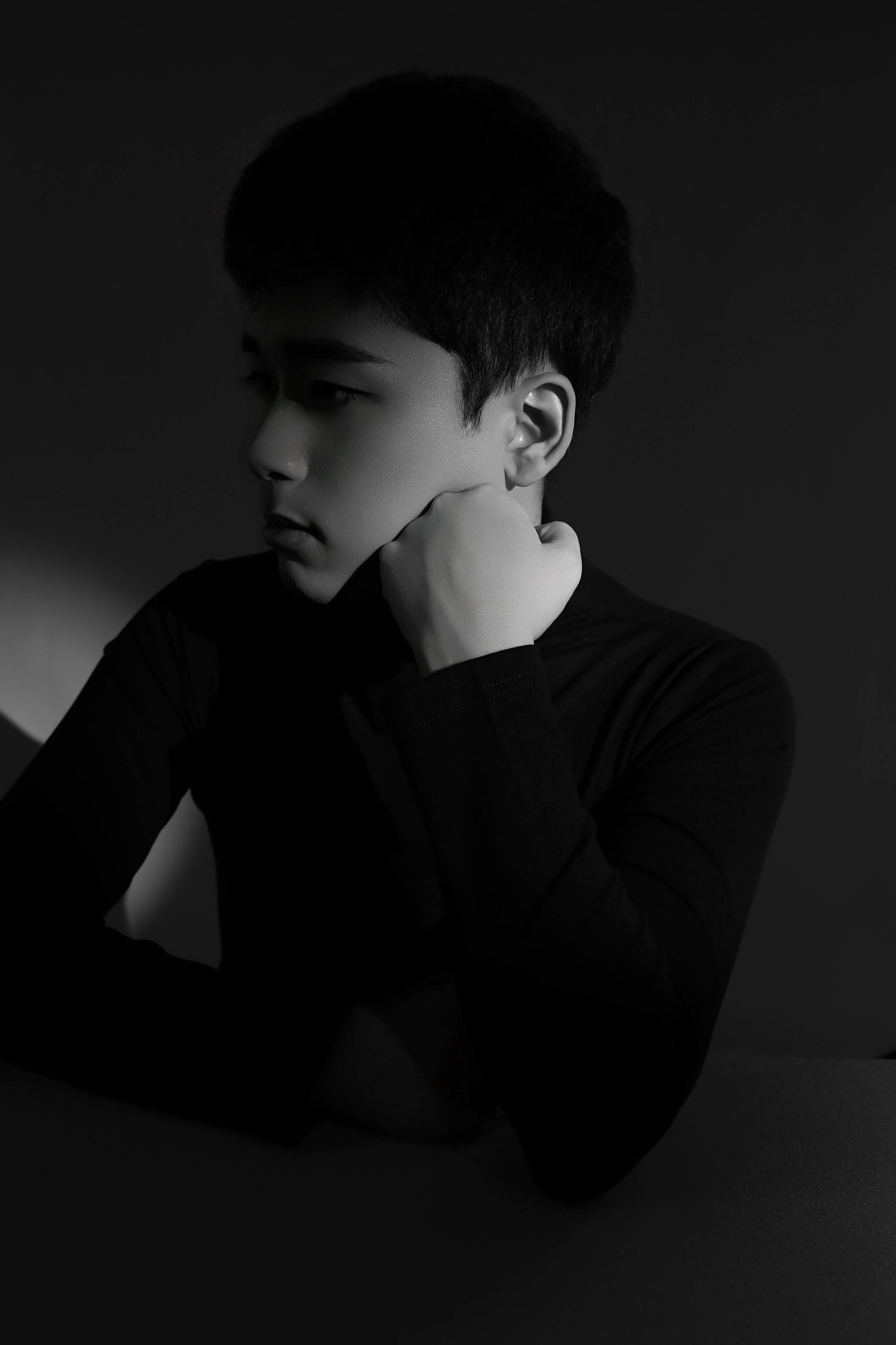 高领衫那组黑白大片里,他的轮廓被光影削得干净,指尖抵着下颌的动作,却带着点孩子气的局促。没有浓墨重彩的修饰,只有布料贴在皮肤的柔软、骨节分明的手腕,和眼神里欲言又止的干净。这种呼吸感是他的底色:不抢镜,却像白噪音一样舒服,让镜头愿意慢下来,接住他每一个没那么完美的自然瞬间。