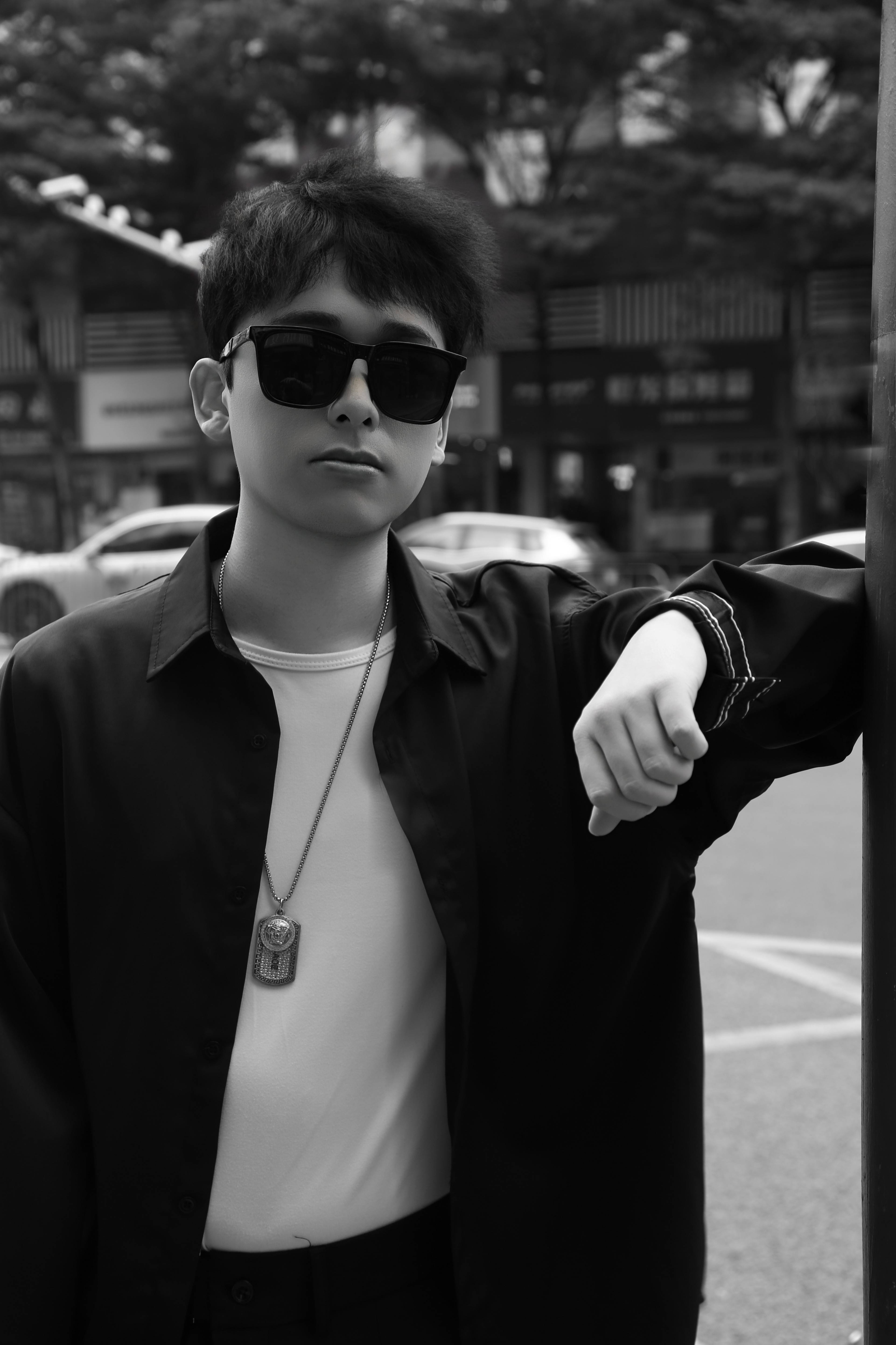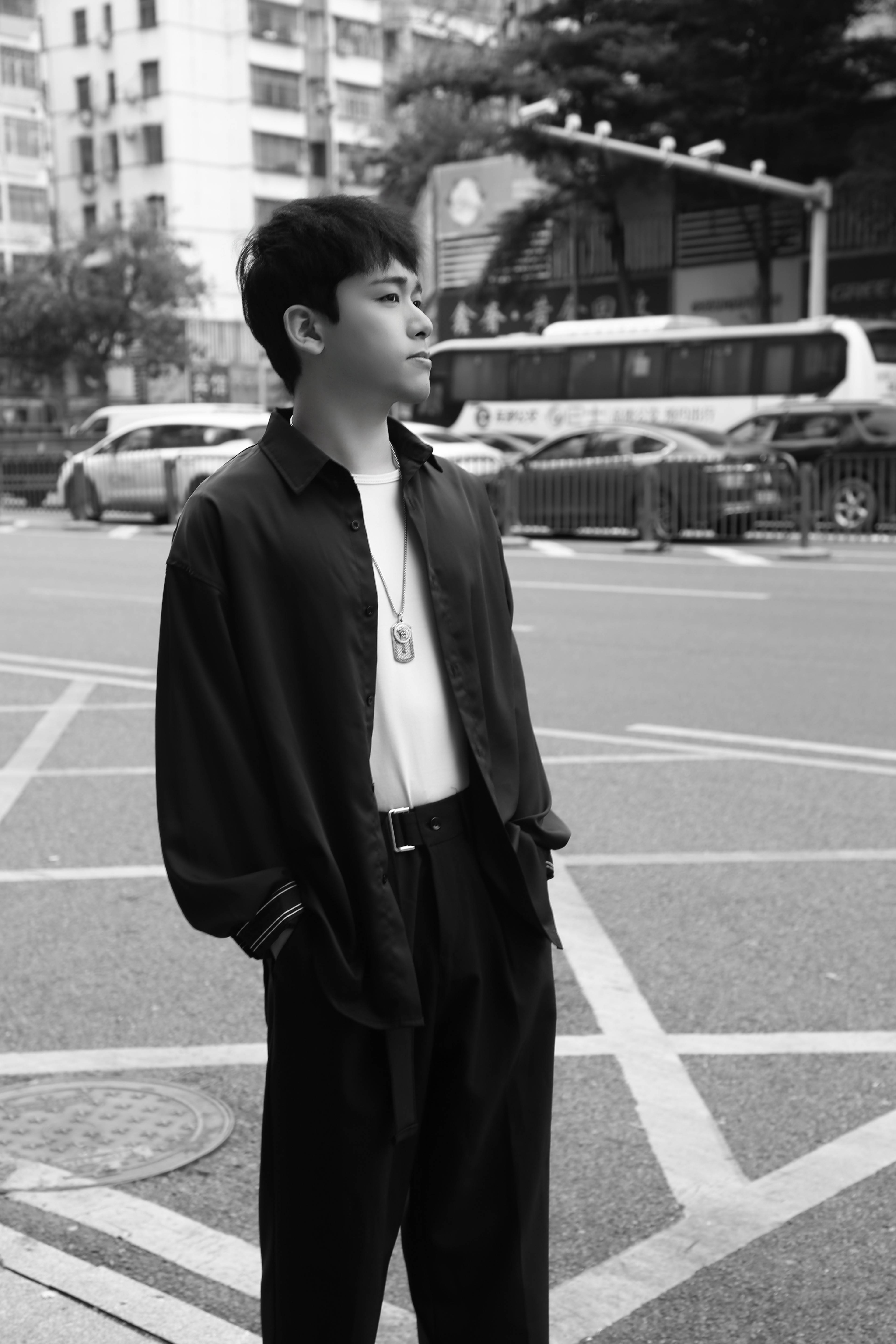 街拍造型里的黑衬衫搭白 T,项链垂在领口,墨镜遮了半张脸,却遮不住耳尖的弧度 —— 不是刻意营造的潮人距离感,是少年人第一次穿 oversize 衬衫,把手插进口袋时的自在。背景里的车流和路灯是城市的烟火,他站在其中,像刚结束晚自习、慢悠悠晃回家的学生,连风掀起衣角的节奏,都踩着少年专属的松弛节拍。
