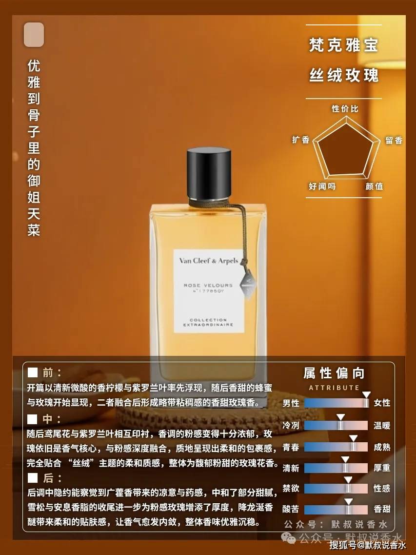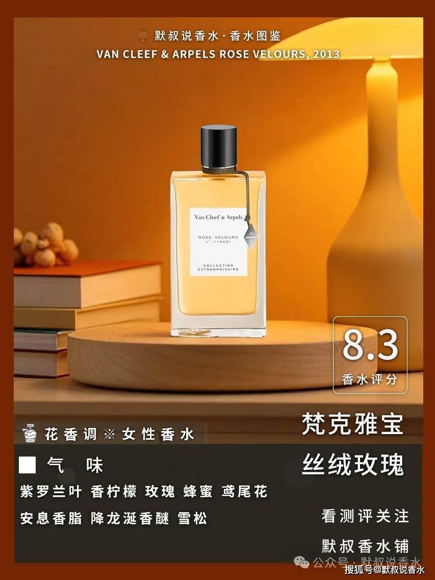 这款梵克雅宝非凡珍藏系列花香调香水,玫瑰香具丝绒包裹感,层次馥郁优雅,风格偏成熟,留香持久,与玫瑰之约相似但更显沉稳质感。