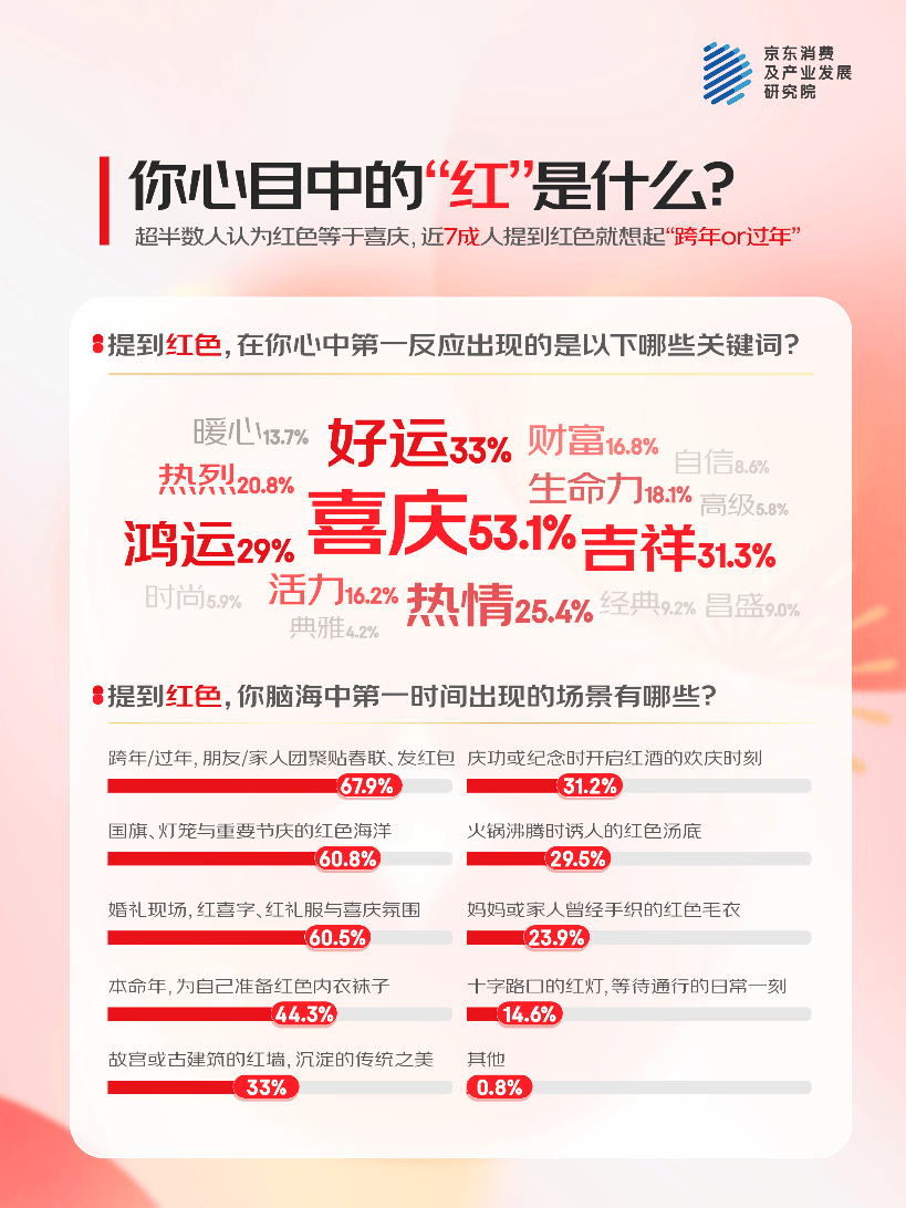 l 为什么是红色?红色在中国人的审美基因里是经久不衰的,有着浓浓的节日氛围。53.1%的人认为红色的基因是喜庆,是好运(33.0%)、是吉祥(31.3%)、是鸿运(29.0%);此外,红色还透露着热情(25.4%)、热烈(20.8%)和生命力(18.1%)。所以,超六成的人都会在跨年特意准备穿红/用红,这不仅仅是一种文化的传承,更是一种积极的心理仪式感,为新年注入信心和能量。