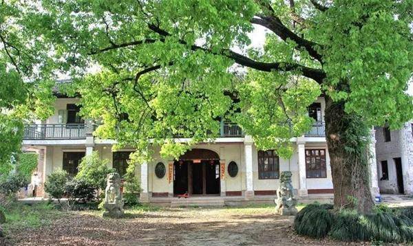 房子的门楼精美别致,大门两侧还设有边门,门楣上的石匾上隐约刻着“五福临门”的字样,显得庄重而祥瑞。踏入门厅,可以看到一个小巧的凉亭,凉亭四周的石栏上刻着二十四孝子图,展现了浓厚的传统文化气息。 院子里种着两棵高大的樟树,为庭院增添了生机与绿意。主楼为两层小洋楼,四周设有环绕的廊道。底层廊下支撑着雕刻精美的砖柱,上面雕刻着人物和花卉的浮雕,细腻而生动。二楼的围廊宽敞,栏杆为绿色木质,屋檐下的花短柱雕工精致,显示出建筑的工艺之美。