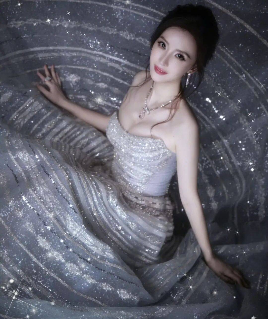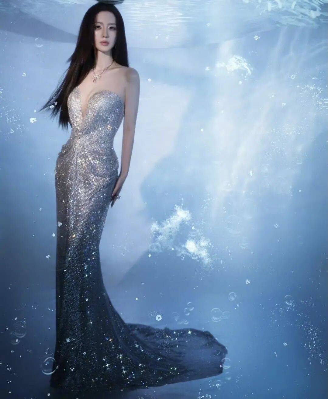 这组照片的策略堪称高明。在信息爆炸的时代,“早八营业”精准地避开了晚间红毯的密集轰炸,在一天中注意力相对空白的时段,投下了一枚视觉震撼弹。银蓝色渐变的挂脖鱼尾长裙,如同将深海的一角披在了身上。碎钻如星光般洒落裙摆,与模拟的水波光影交织,当她侧身回眸,露背剪裁淋漓尽致地展现出优越的背部线条与腰臀曲线。