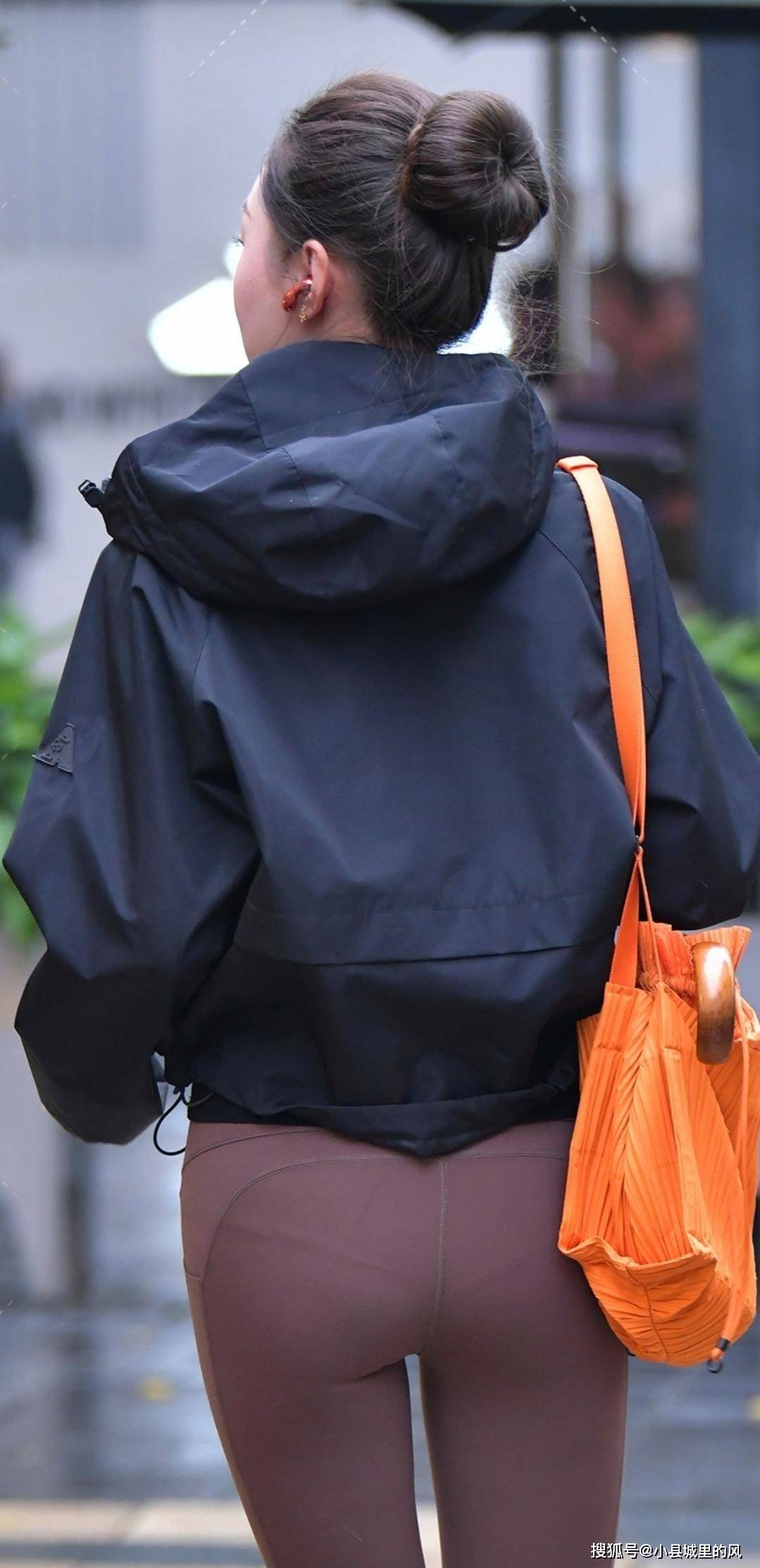 配饰的选择让造型更具细节感,亮橙色的褶皱斜挎包与焦糖棕瑜伽裤形成同色系的深浅过渡,高饱和度的橙色为整体造型注入了活力,成为街头吸睛的视觉亮点;简约的耳钉与无线耳机则增添了都市女性的精致与便捷。整体造型将机能风的酷飒与运动装的舒适完美融合,黑棕撞色的搭配在都市街头中脱颖而出,是日常休闲与轻运动场景的理想穿搭选择。