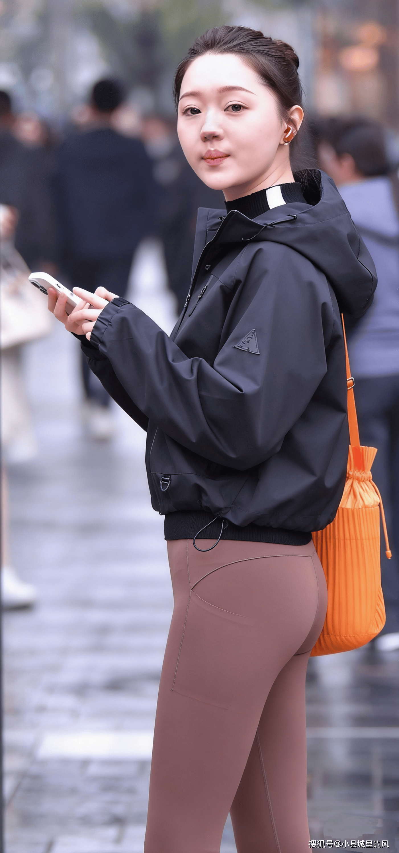 在都市街头的日常穿搭中,运动风与撞色巧思的结合总能打造出亮眼造型,这组搭配以黑色机能风外套搭配焦糖棕瑜伽裤,用鲜明的色彩对比与舒适的版型,勾勒出兼具活力与时尚的街头风格。