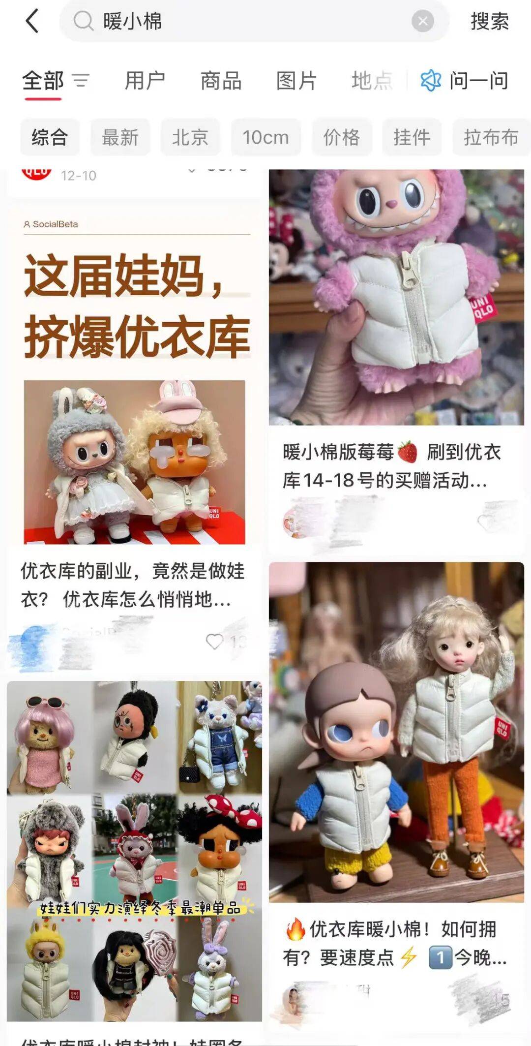“暖小棉”挂件爆火始于娃圈的自发打卡,泡泡玛特Labubu、玲娜贝儿等潮流玩偶穿上“暖小棉”的穿搭照片在小红书、抖音等平台广泛传播,相关话题累计浏览量超百万,不少用户称为给玩偶买“冬装”专程入手优衣库棉服,热潮随后还延伸到了宠物圈,玄风鹦鹉等小型宠物也穿上改造后的“暖小棉”的视频进一步引发模仿热潮。