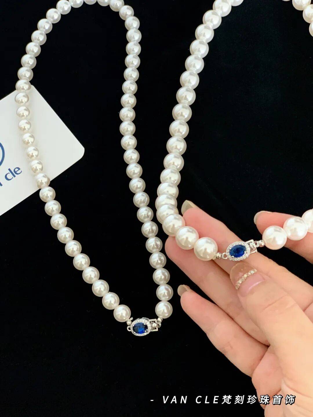 蓝锆石镶嵌作为整串珍珠的点晴之笔,颠覆传统卡扣只能放在后面的位置,正面侧面戴都是妥妥的吊坠感。