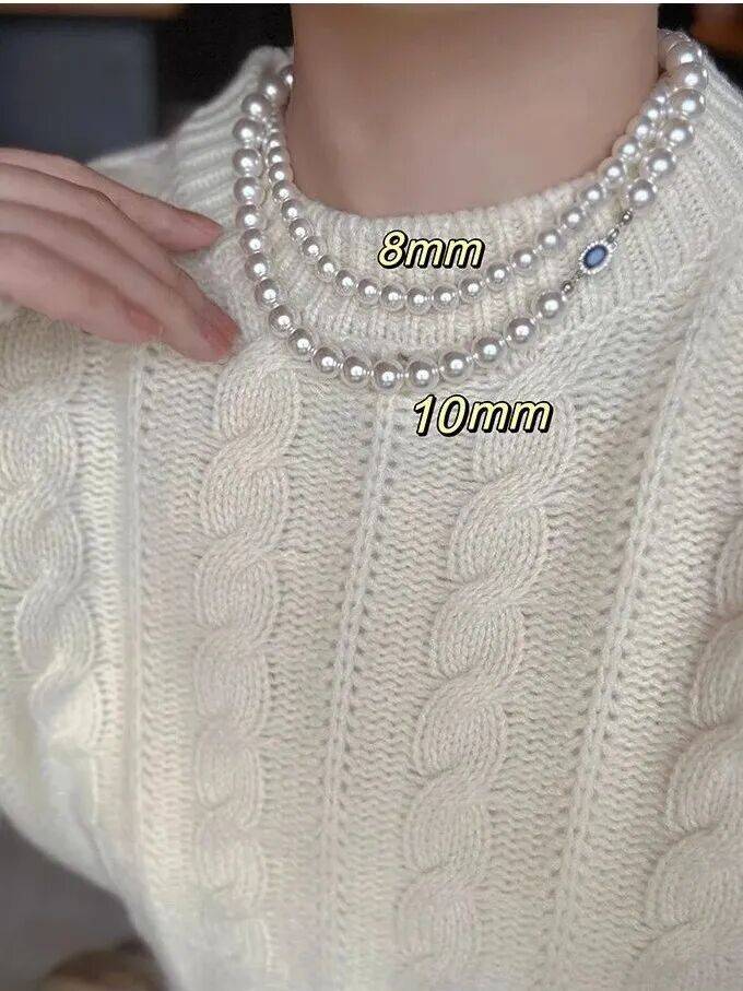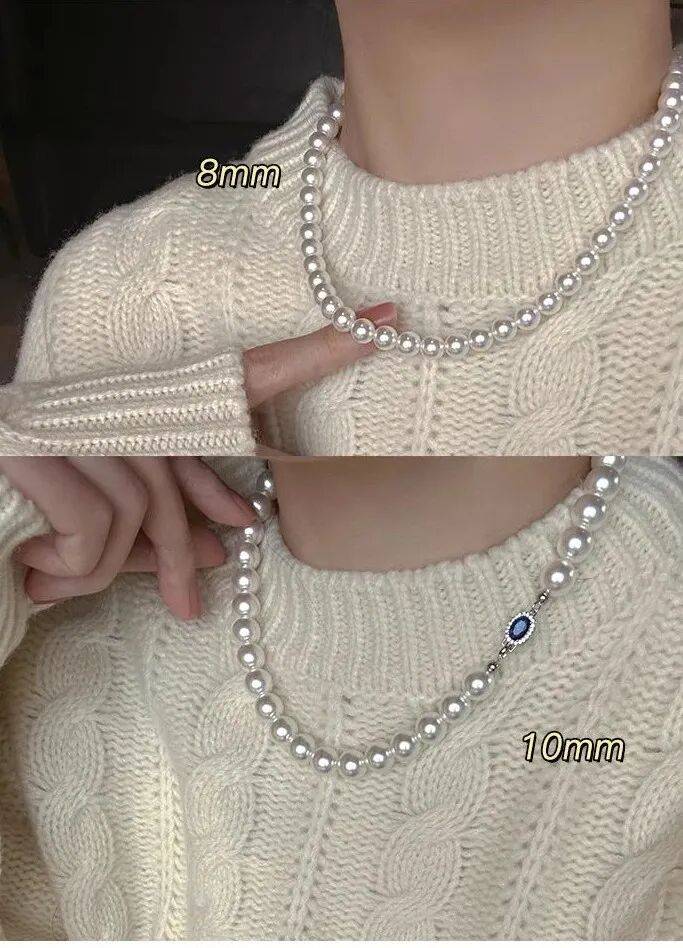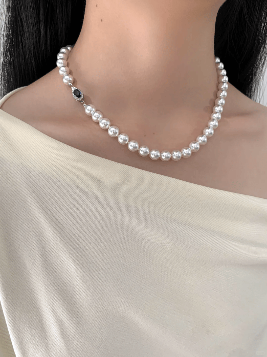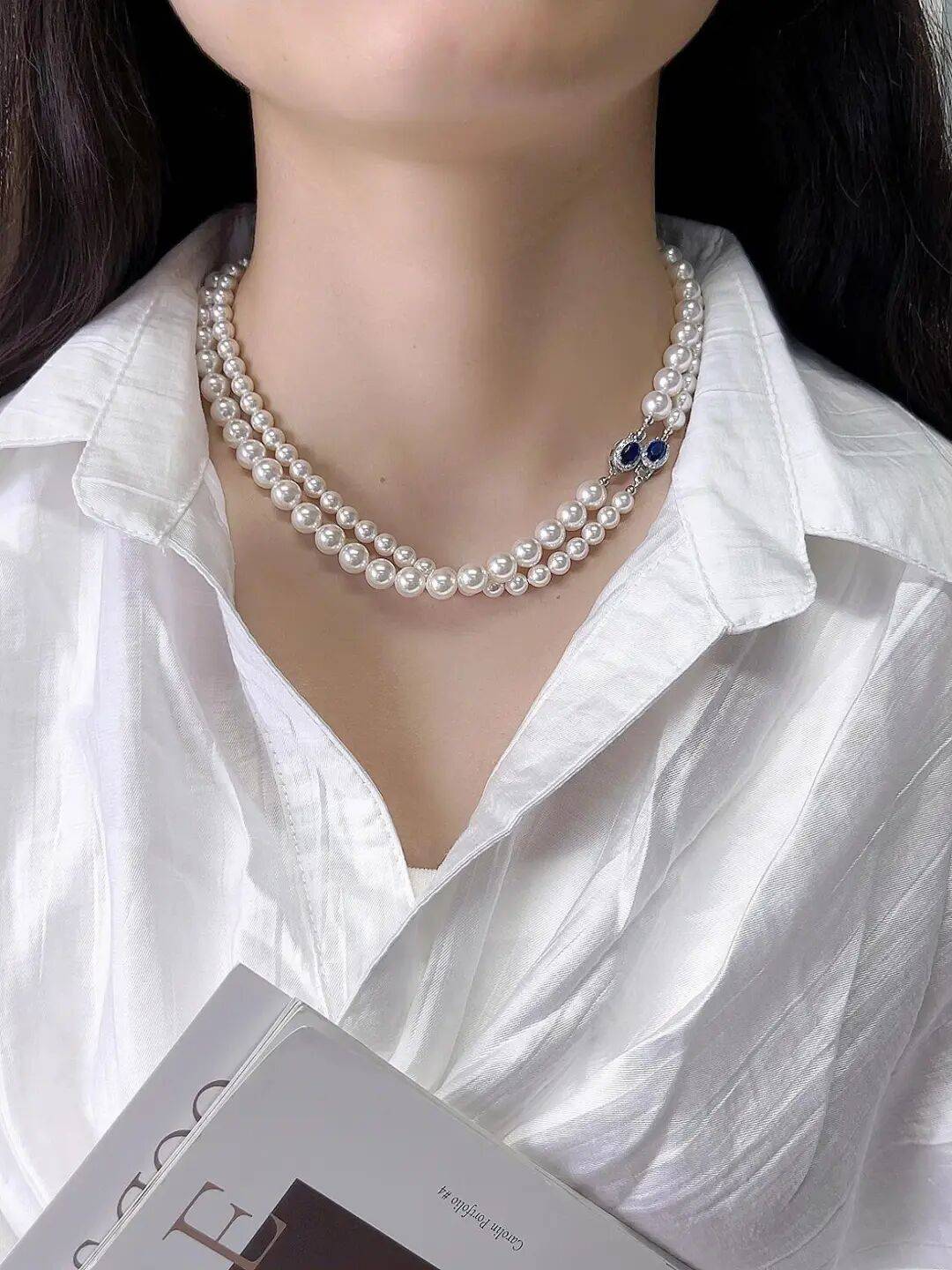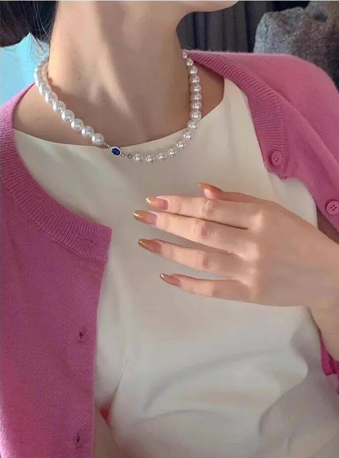 大颗珍珠坠于脖颈之间,8~10mm的施家珍珠,戴上尽显脖颈纤细。