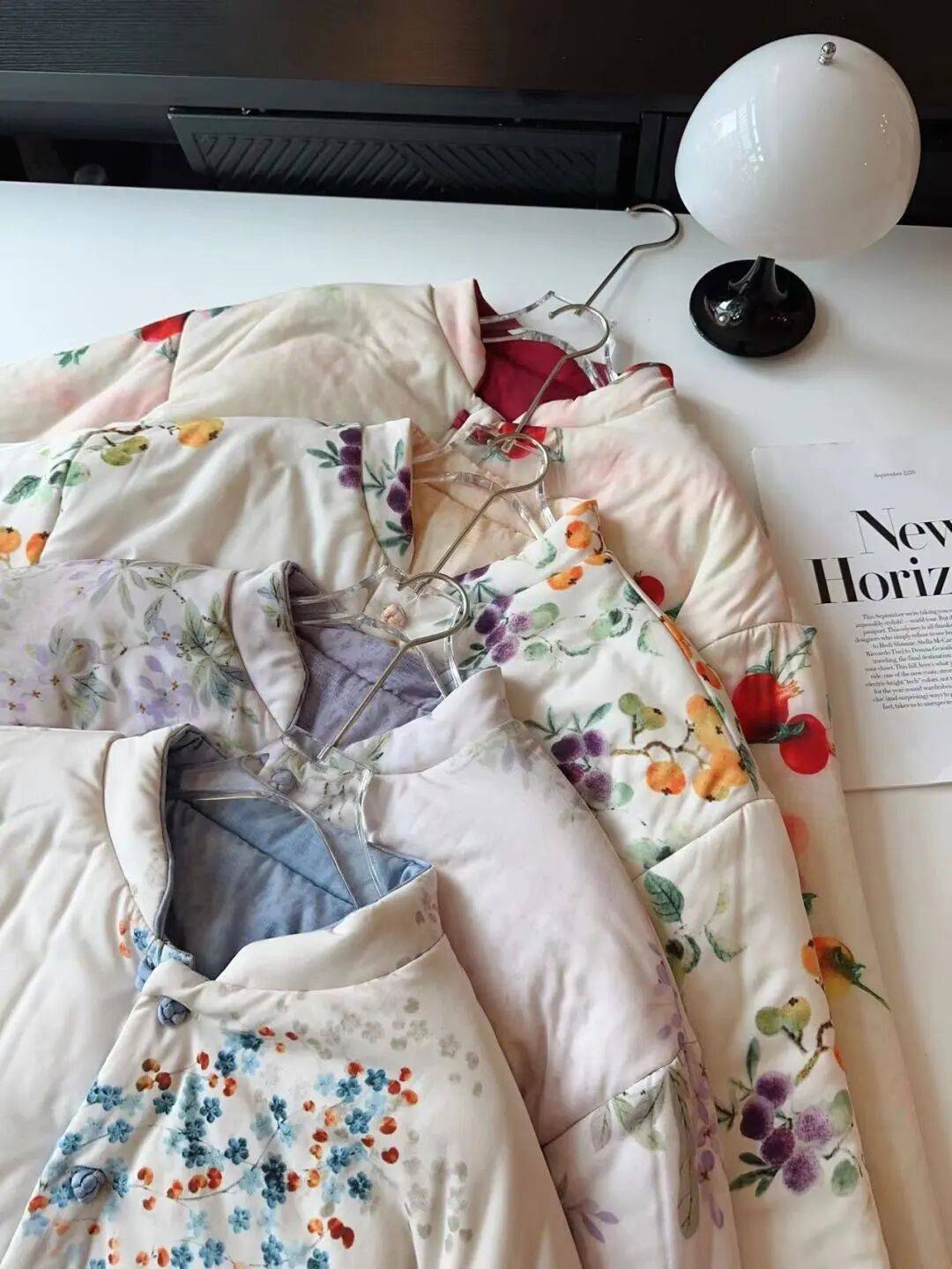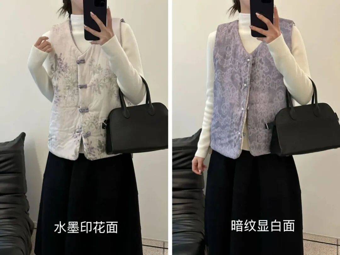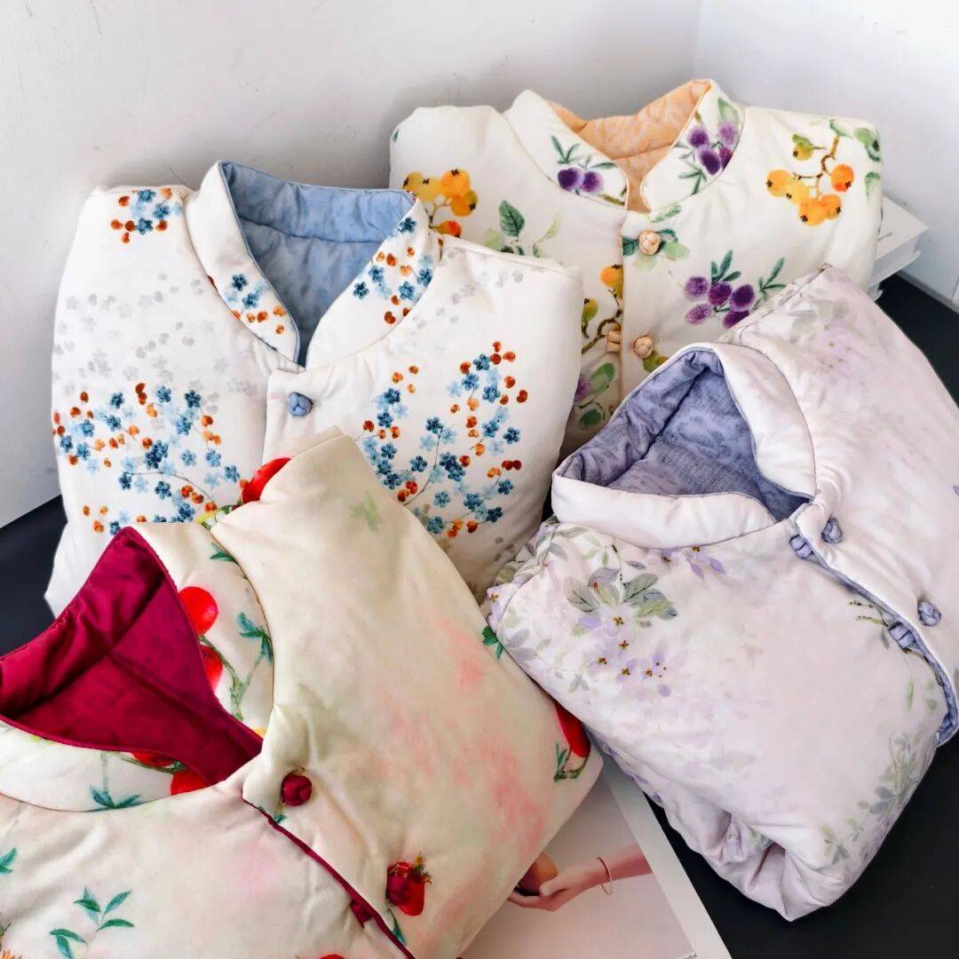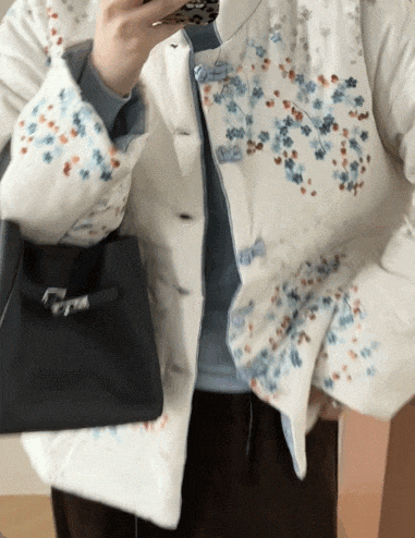 看看这水墨粉的印花,不是俗艳的花里胡哨感,而是像把水墨画栽进了衣料里,花果纹样还藏着国风吉祥寓意,温柔里裹着中式的雅致,正面反面两穿等于把温婉和清新都揣进了冬天。