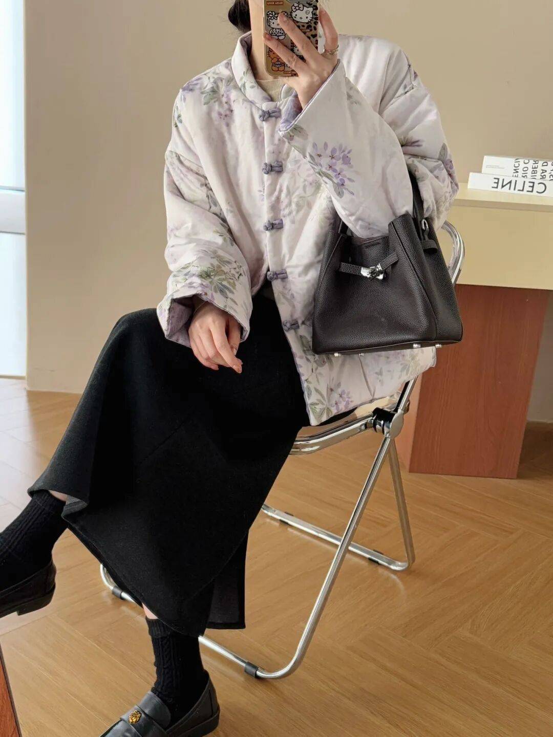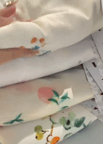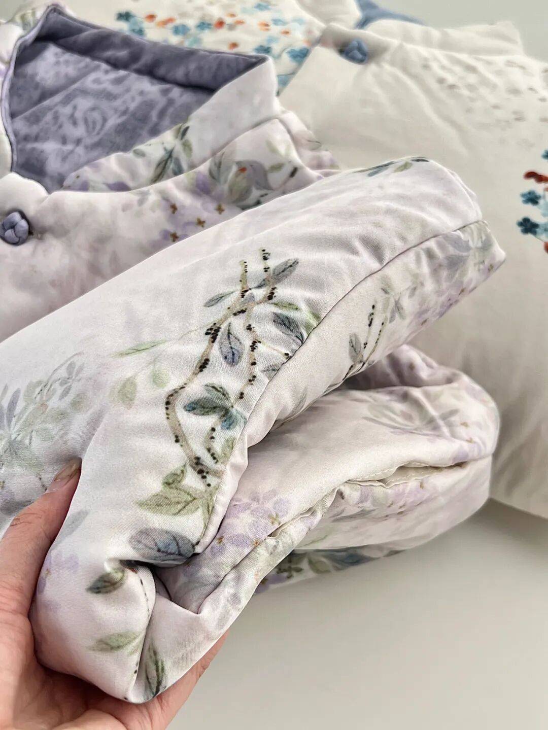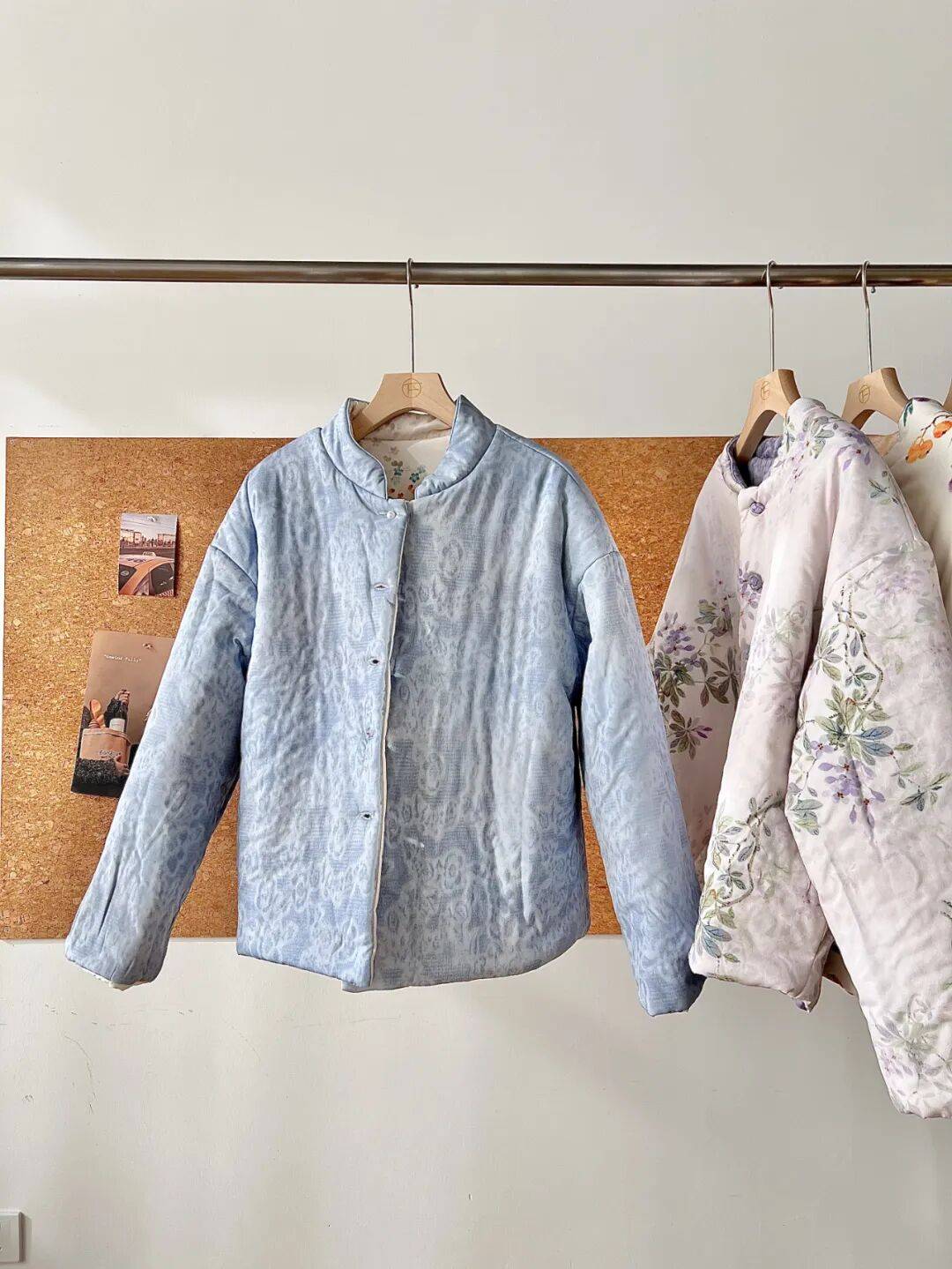 看看这水墨粉的印花,不是俗艳的花里胡哨感,而是像把水墨画栽进了衣料里,花果纹样还藏着国风吉祥寓意,温柔里裹着中式的雅致,正面反面两穿等于把温婉和清新都揣进了冬天。