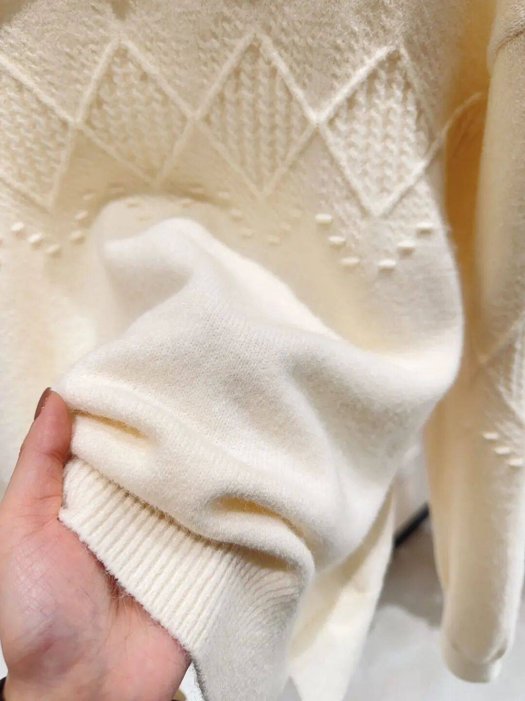 而且我们整件都采用德国STOLL横机,顶尖轻奢牌的御用针织机织造,虽然成本高了一些,但面料做到了疏密有制,花纹做到了精致立体,上身自然更显质感,没有普通毛衫的沉闷。