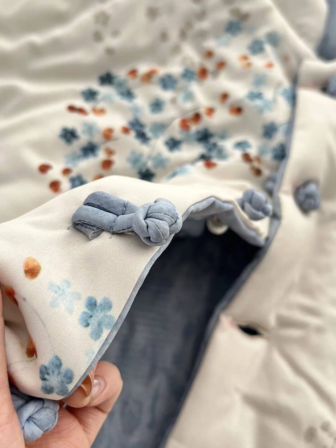 另一面淡雅的国风印花,哑光质感,自带低调暗纹,高级耐看,双面穿,穿出不同韵味。