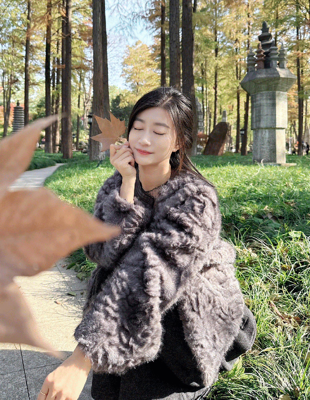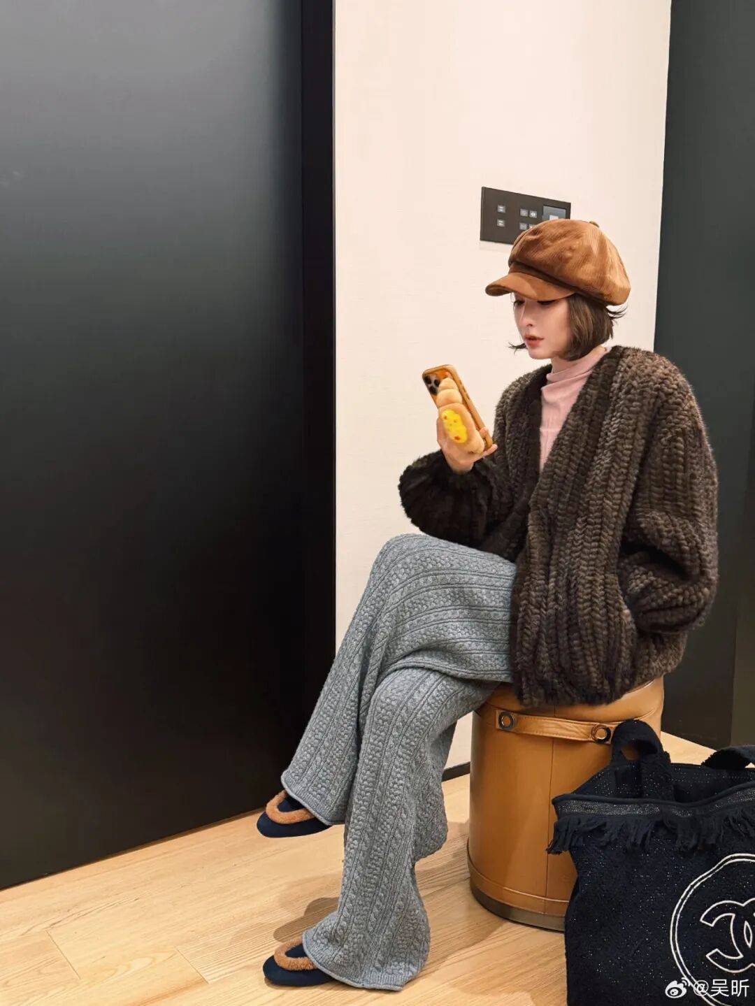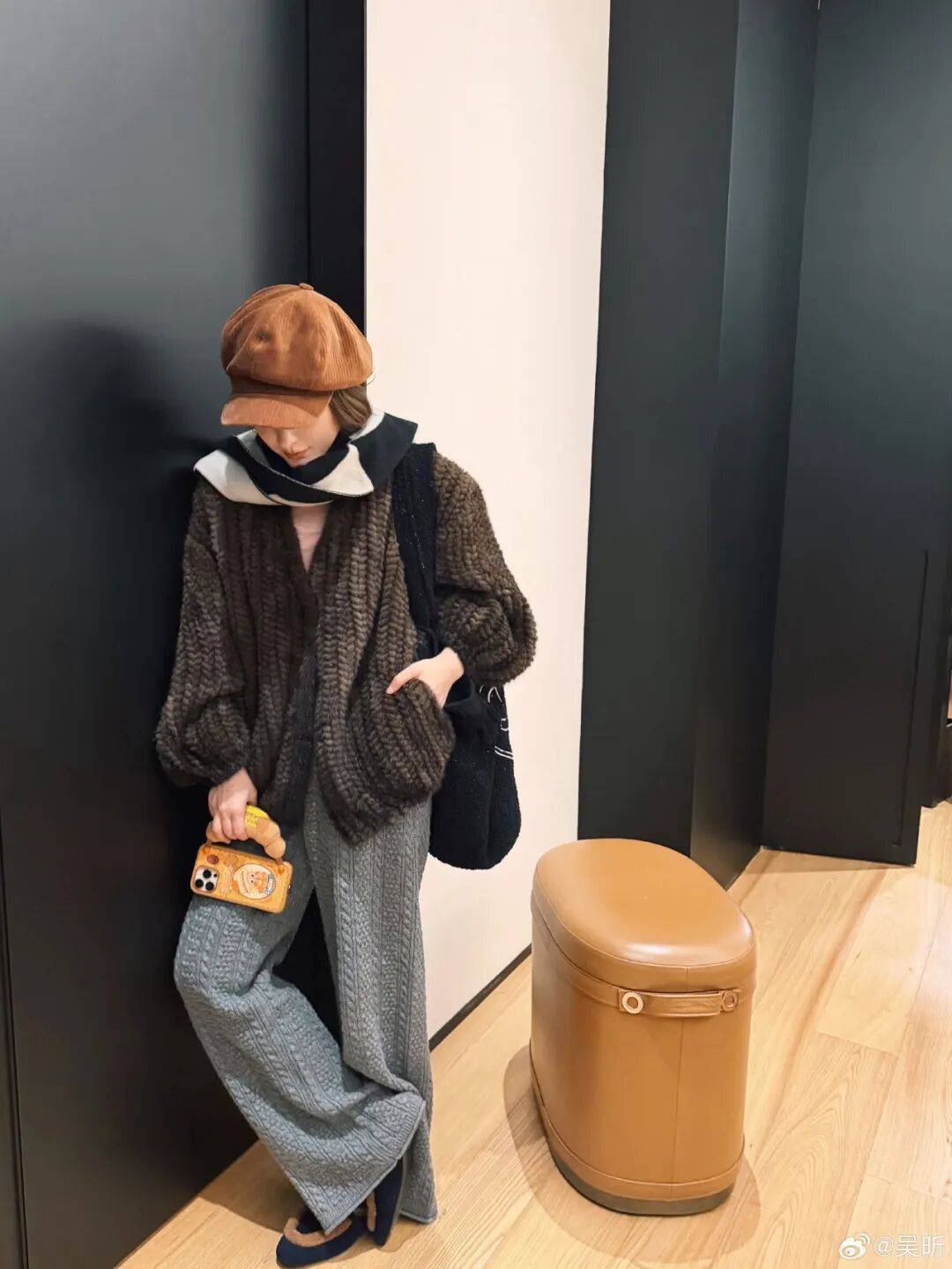 她前几天的年末穿搭这一套也很好看呢,毛毛外套+针织阔腿裤,又暖和又很秋冬贵气。