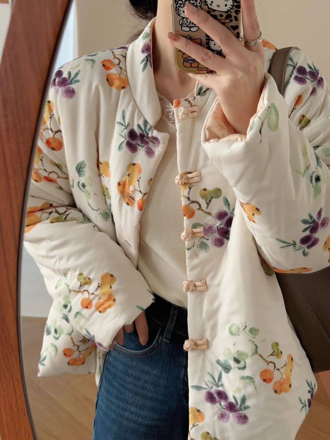 抬手还能轻松揣兜,连内衬的花果纹样都软萌得想rua。