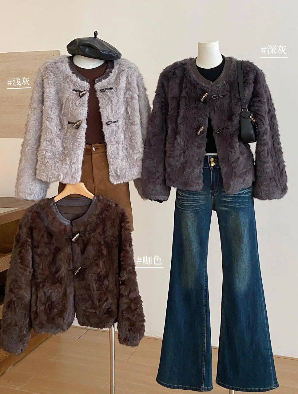 三款经典色系——浅灰色、深灰色和高级棕,每一款都适配不同的穿搭风格,满足你多样的造型需求。