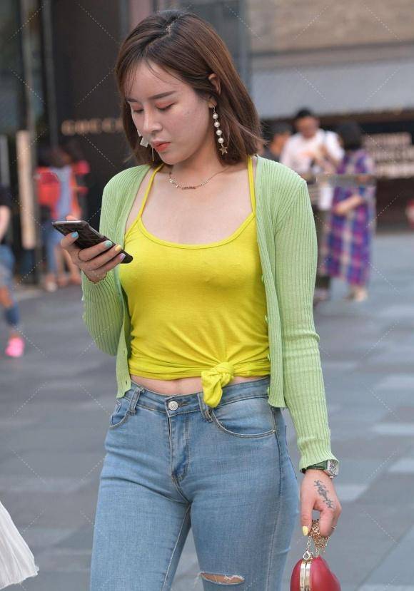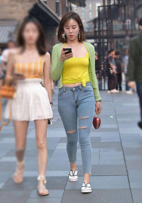 一位时尚女士的这套搭配极具参考价值,上身选择果绿色针织开衫,内搭黄色吊带衫,下装搭配破洞牛仔裤,脚踩白色休闲鞋。整套造型简约利落,尽显休闲随性的格调,色彩搭配和谐养眼,既带着灵动的感性韵味,又不失独特气韵,轻松展现出时尚美感。
