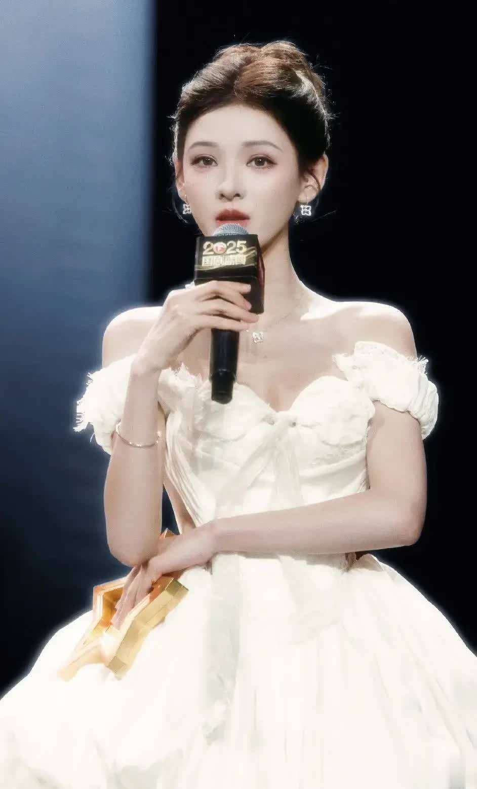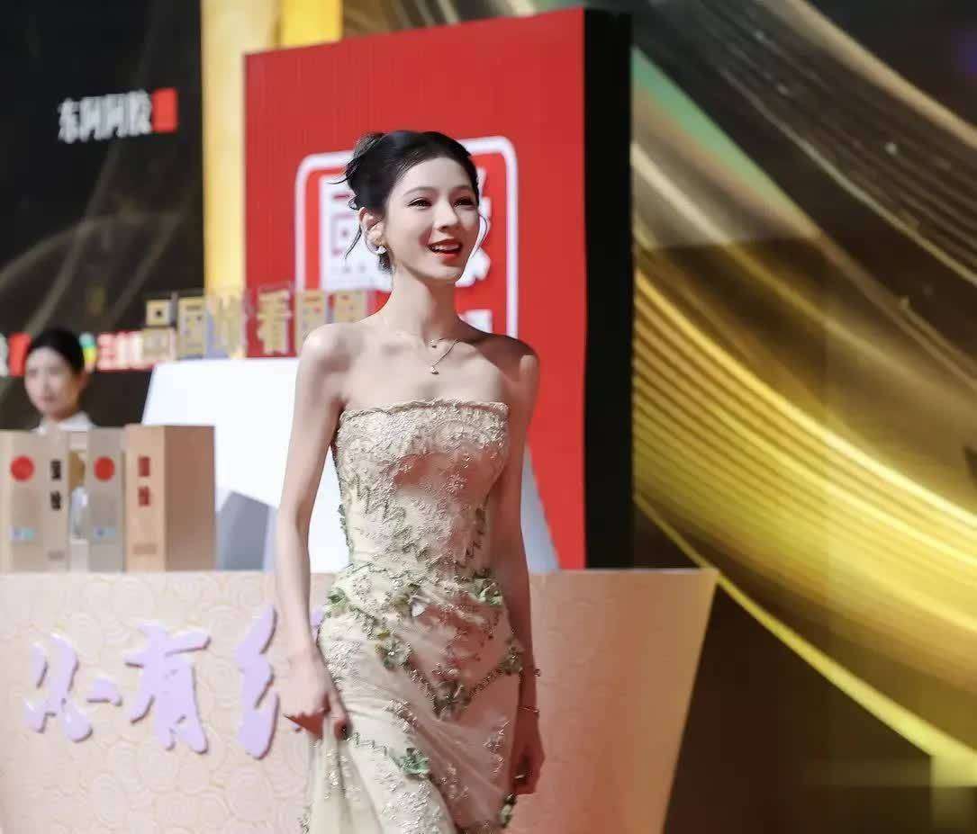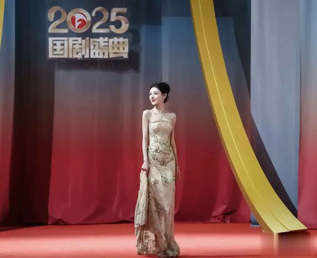 在2025年国剧盛典的红毯上,张予曦身穿一袭香槟金色抹胸长裙亮相,瞬间吸引了全网的关注。裙子上密布着碎钻和立体花卉刺绣,在温暖的灯光下,仿佛闪烁的金光流动。抹胸设计完美勾画出她的直角肩和纤细的腰线,配上高盘发髻和耳畔轻扬的碎发,巧妙地融合了古典的贵气和灵动的柔美。这一造型不仅在视觉上产生强烈的冲击力,更因为她自然放松的仪态,赢得了网友的赞誉,被称为从古风画中走出的公主。