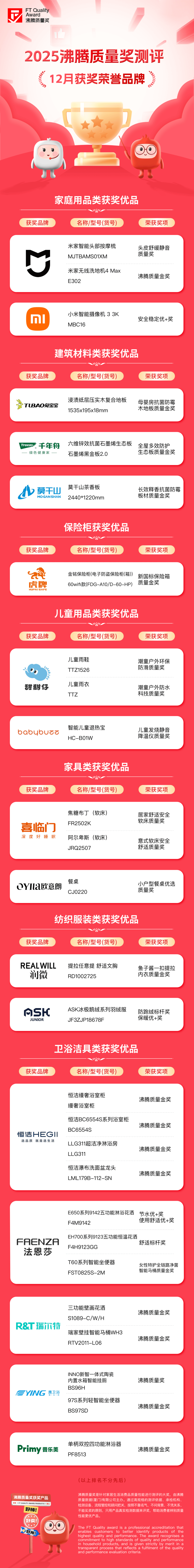本期共揭晓17家品牌27款获奖产品,现将2025年度沸腾质量奖测评12月获奖品牌公布如下(排名不分先后):