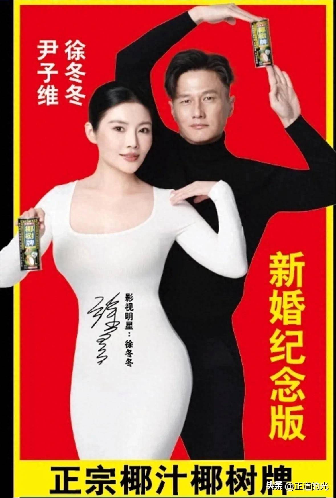 徐冬冬在社交平台分享了一张她与尹子维合作拍摄的椰树宣传海报,并称这是他们婚礼的特别版,非卖品。她还表示,所有受邀参加两人婚礼的嘉宾将会收到特别版的椰汁作为礼物。照片中,徐冬冬身穿一条白色抹胸长袖紧身裙,左手搭在尹子维肩膀上,右手拿着一瓶椰汁。尹子维则做出了徐冬冬最经典的椰树广告造型,穿着高领毛衣和黑色牛仔裤,一身黑衣让他显得四肢修长,网友们调侃他看起来像是在拍秋衣广告。
