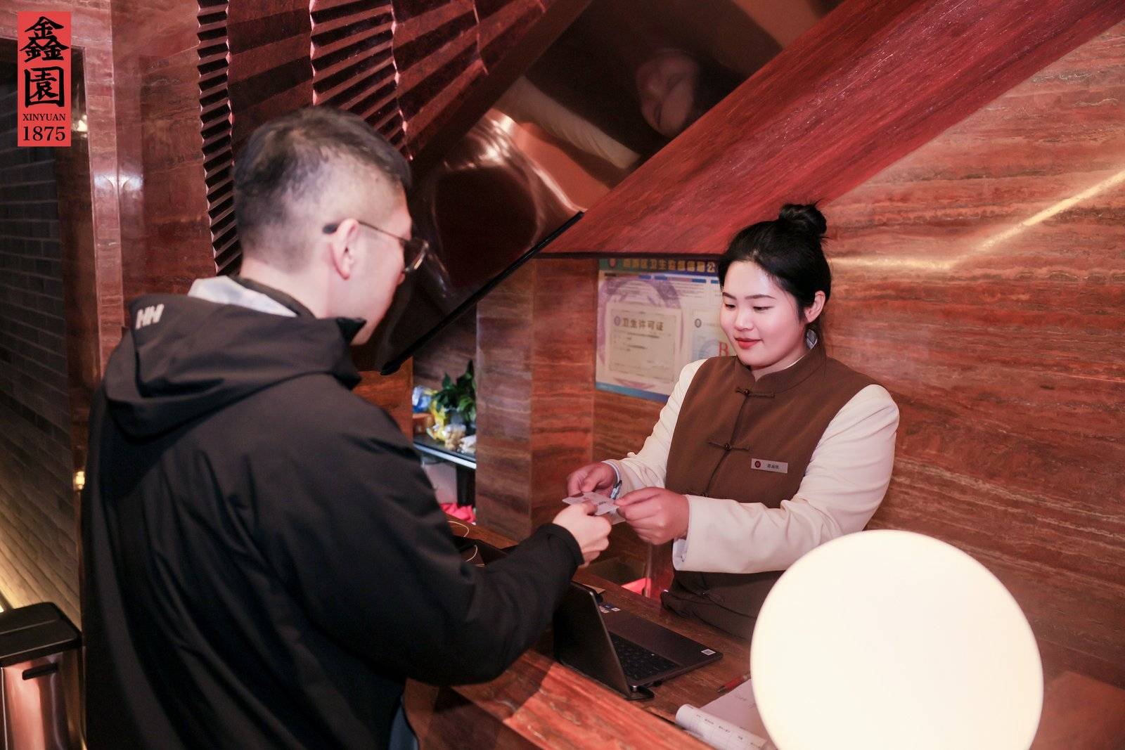 鑫园1875酒店,位处烟袋斜街 21 号,距什刹海地铁站约 272 ⽶,与什刹海、⿎楼毗邻⽽居,为“北京核⼼区中轴线上,百年浴池改建的智能设计酒店”。其前身为“鑫园浴池”,该浴池为北京最早出现的⼤众洗浴之⼀,相传始创于清光绪年间,距今已有 100 余年历史,创办⼈为清朝太监李莲英义⼦李福庆。什刹海的百年⽔脉与百姓的洗浴记忆交相辉映重焕⽣机。如今的鑫园 1875保留传统的同时,设施智能化升级,其外观与内涵均跟周遭风物文化互为胡同肌理,为⼋⽅来客提供纯正的京味旅居新体验。