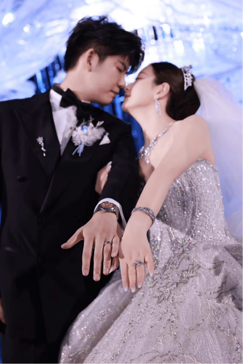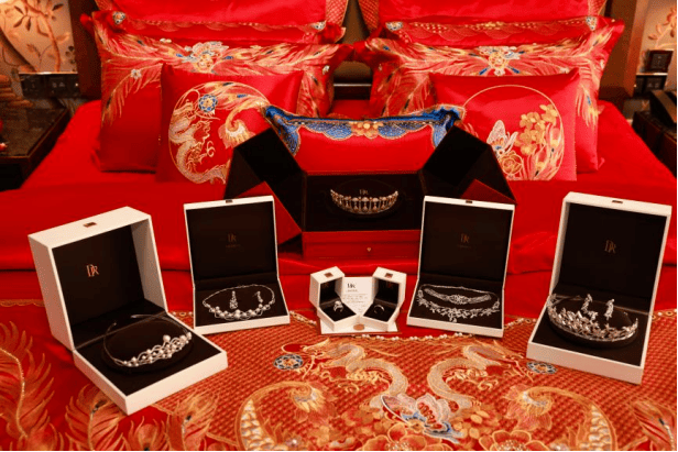 婚礼敬茶环节,黄雅琼身着中式敬茶服,优雅端庄。与之相得益彰的,是那顶独具匠心的DR千金冠。在婚纱照中,黄雅琼就已佩戴过其完整形态,华丽的DR千金冠为简约的纯白婚纱增添了贵气。而在婚礼当日,这顶千金冠更是展现出巧妙设计——它可转换为婚礼五金——包括套链、耳饰、吊坠、手链与胸针。这些转换后的单品,分别点缀于中式敬茶服造型之中,与整体完美融合,毫无突兀之感。