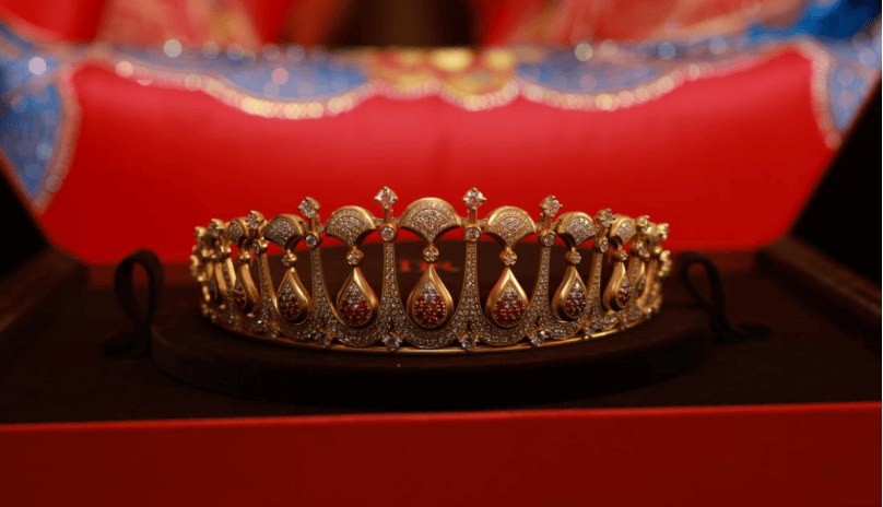 以龙凤为灵感设计出的这顶DR千金冠,不仅熠熠生辉,更是暗含了“人中龙凤,天作之合”的美好寓意。这种寓意与中式敬茶环节所承载的家庭祝福、婚姻美满等文化内涵高度契合,为整个敬茶环节再添一份浓厚的中式浪漫氛围。从完整形态到拆解后的五金,千金冠的设计巧思无疑为这场婚礼增添了独特的魅力,让现场甜度飙升。