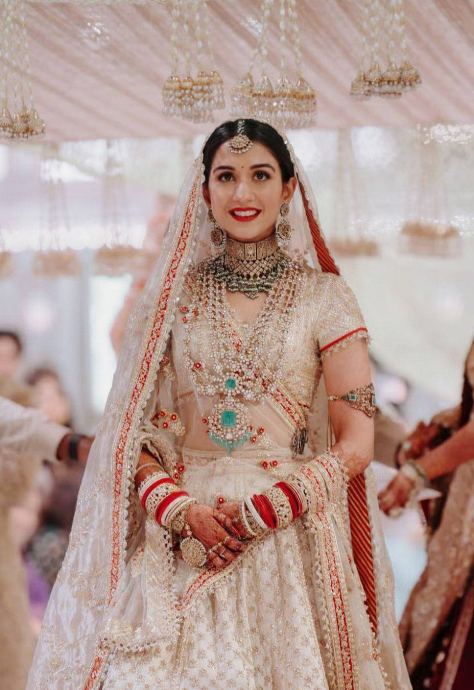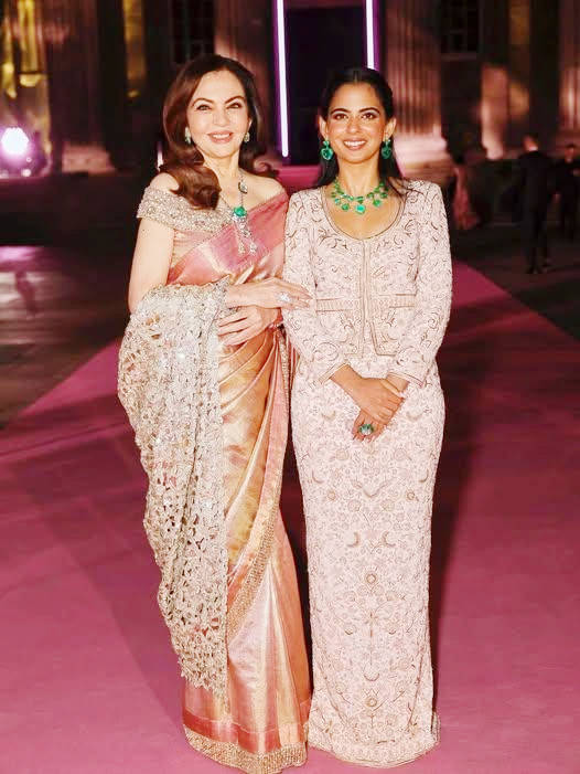在那场世纪婚礼上,她佩戴的三层钻石项链堪称“行走的璀璨星河”,其中最大的一颗梨形钻石重达29克拉,搭配祖母绿鼻钉与水滴形红宝石耳坠,每一件珠宝都经过精心甄选,与红金刺绣的传统婚服相得益彰,将印度传统新娘的华贵与神圣演绎到极致。