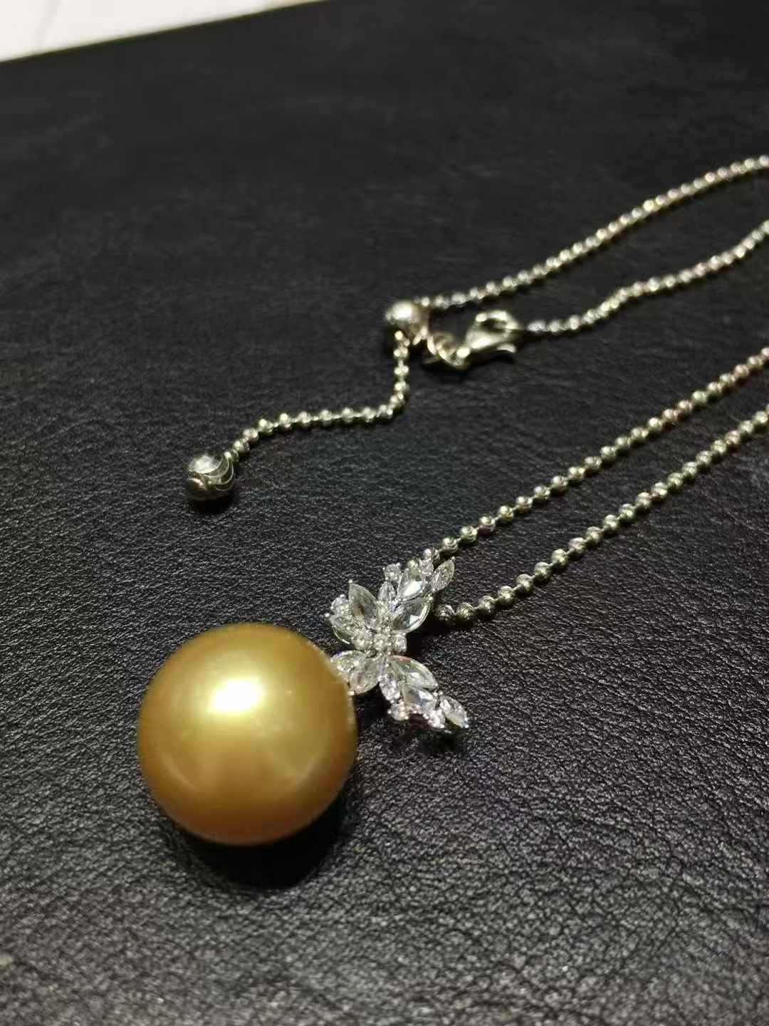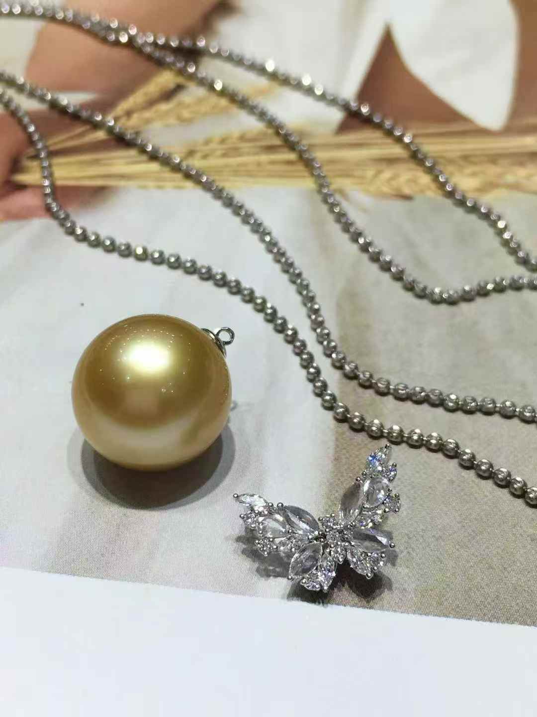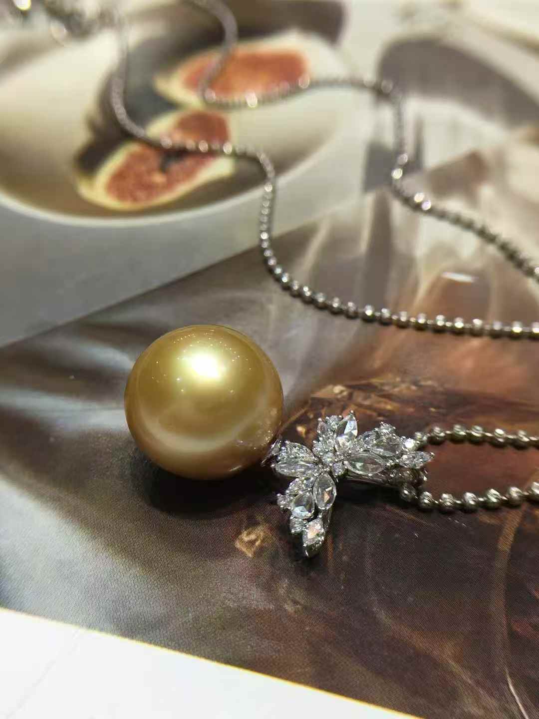 超养眼的一枚浓金坠!13-14mm完美天然色,18k金钻石镶嵌,两用的,钻石蝴蝶可以单戴