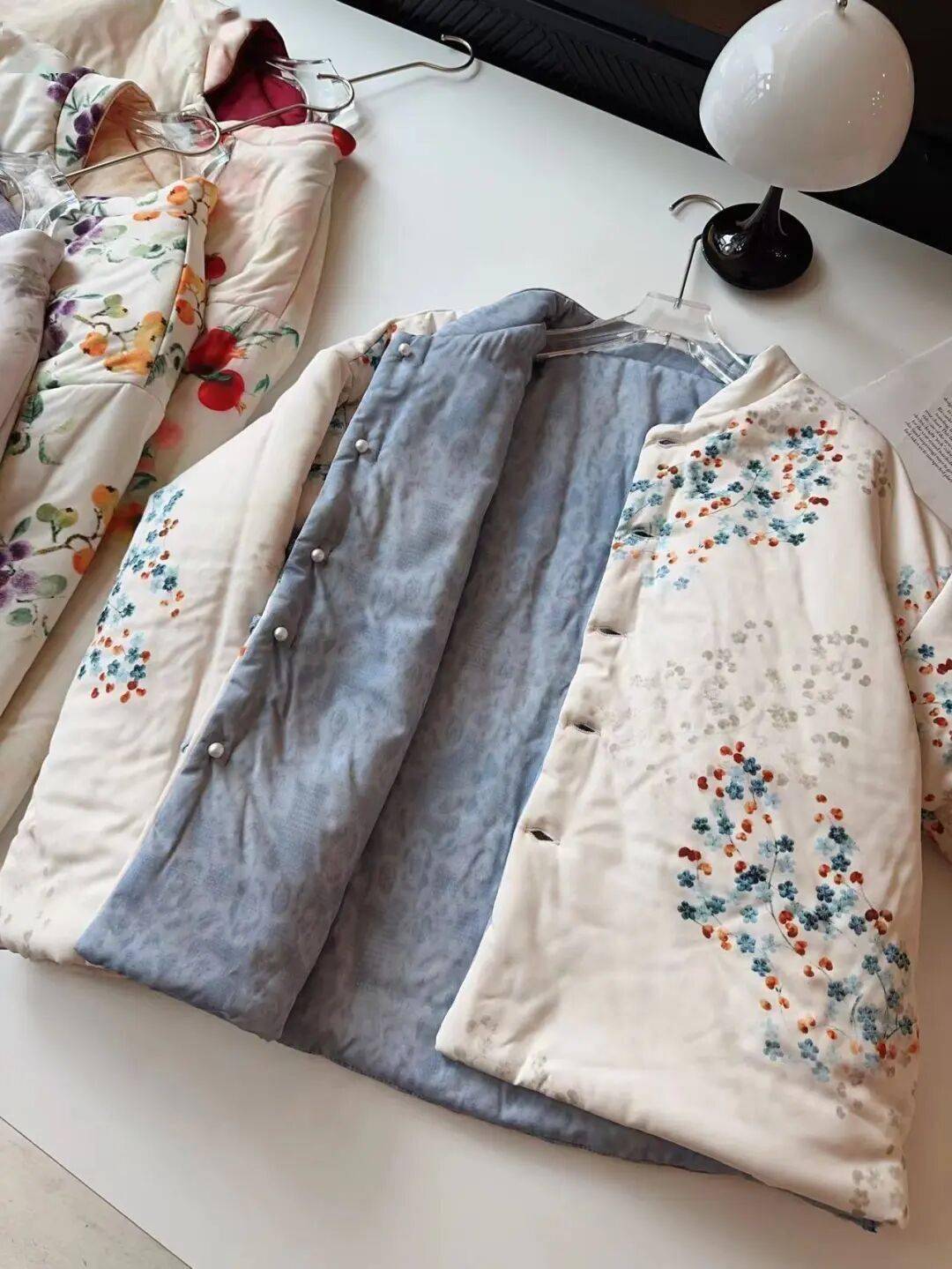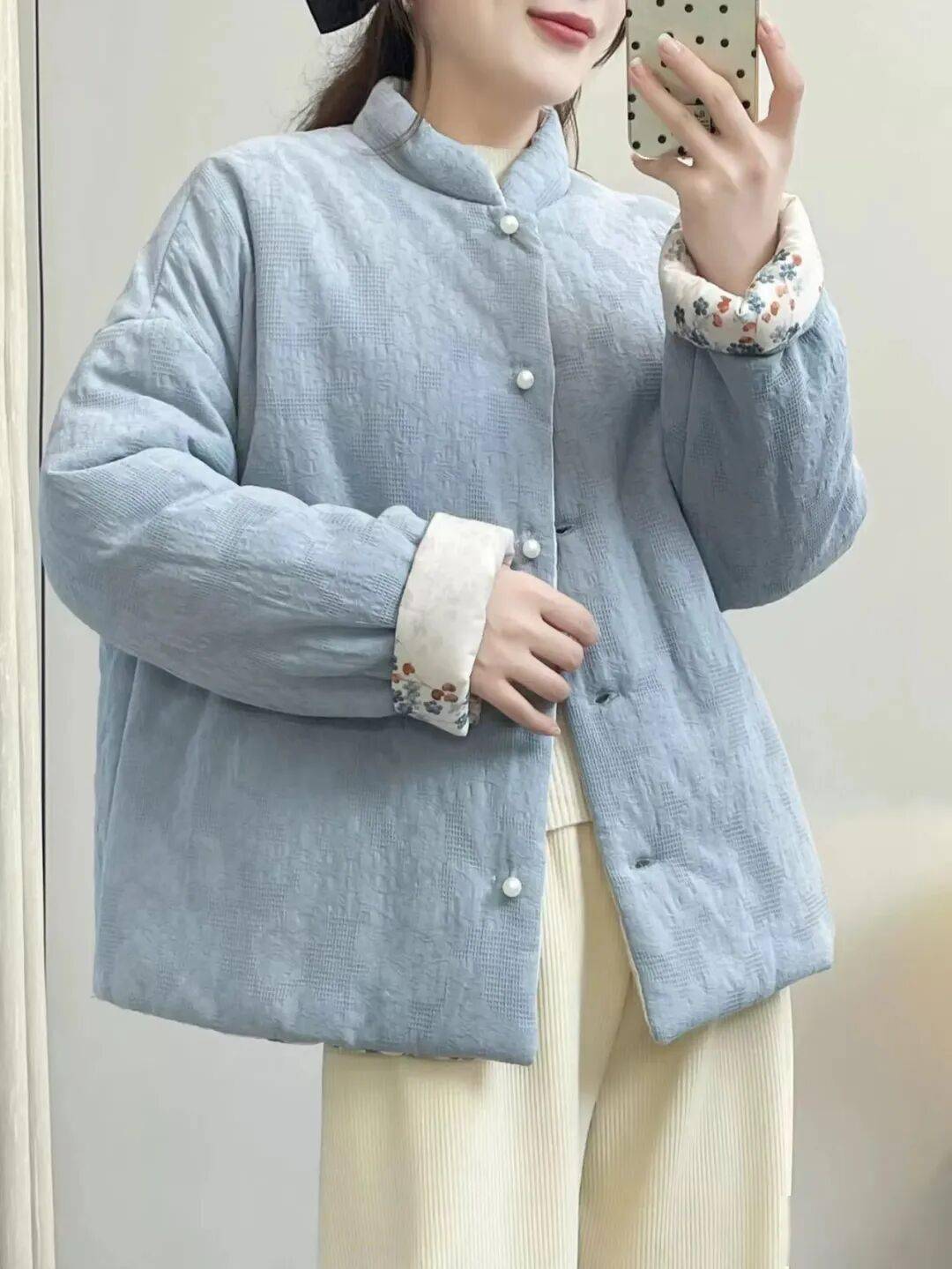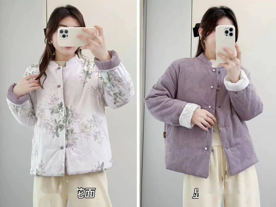 跟市面上常见的单面外套完全不一样,这款新中式棉服采用双面结构,工艺难度直接翻倍。