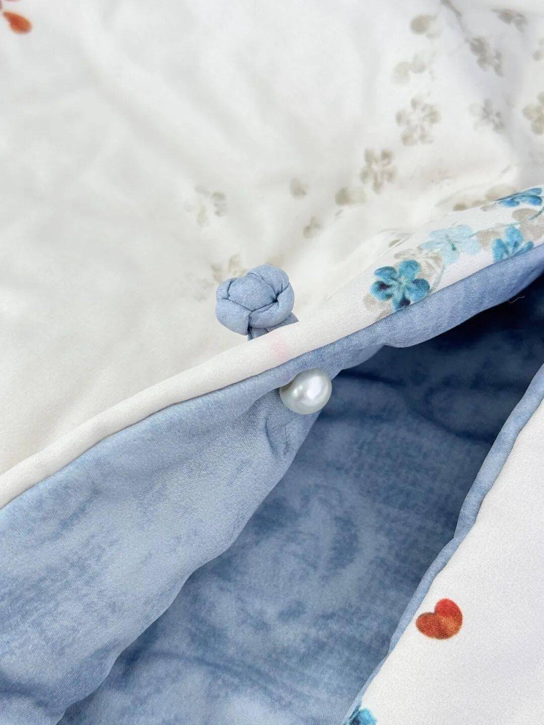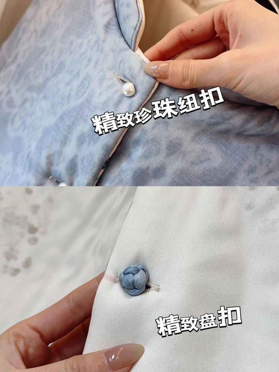 暗纹那一面珍珠扣,有一点柔光感,看着就精致;印花那一面中式盘扣,小巧利落,一下就把中式韵味点出来