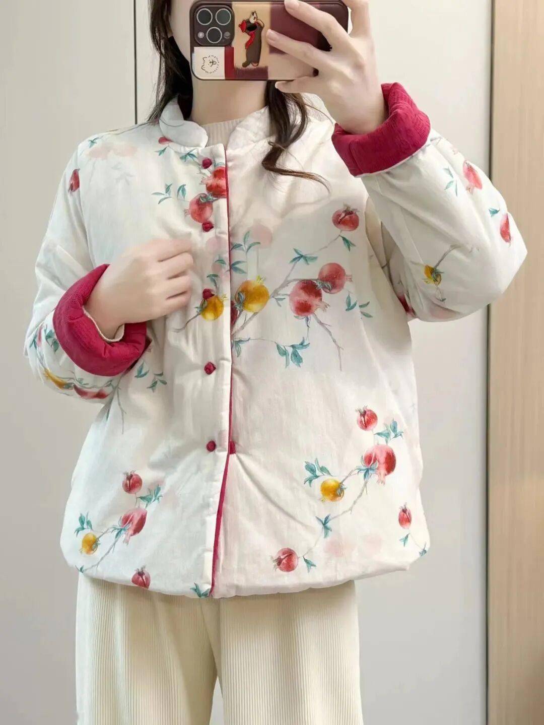 一面是水墨红石榴印花,饱满的果纹藏着“多子多福”的吉意,像把新年的喜庆裹进了水墨画里。