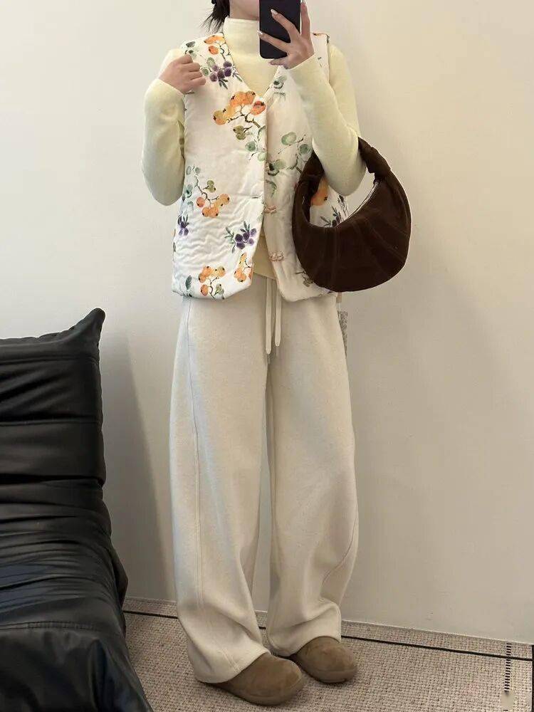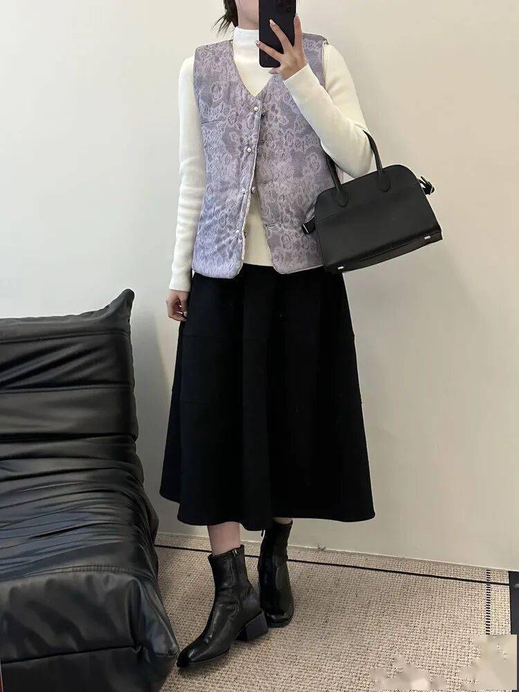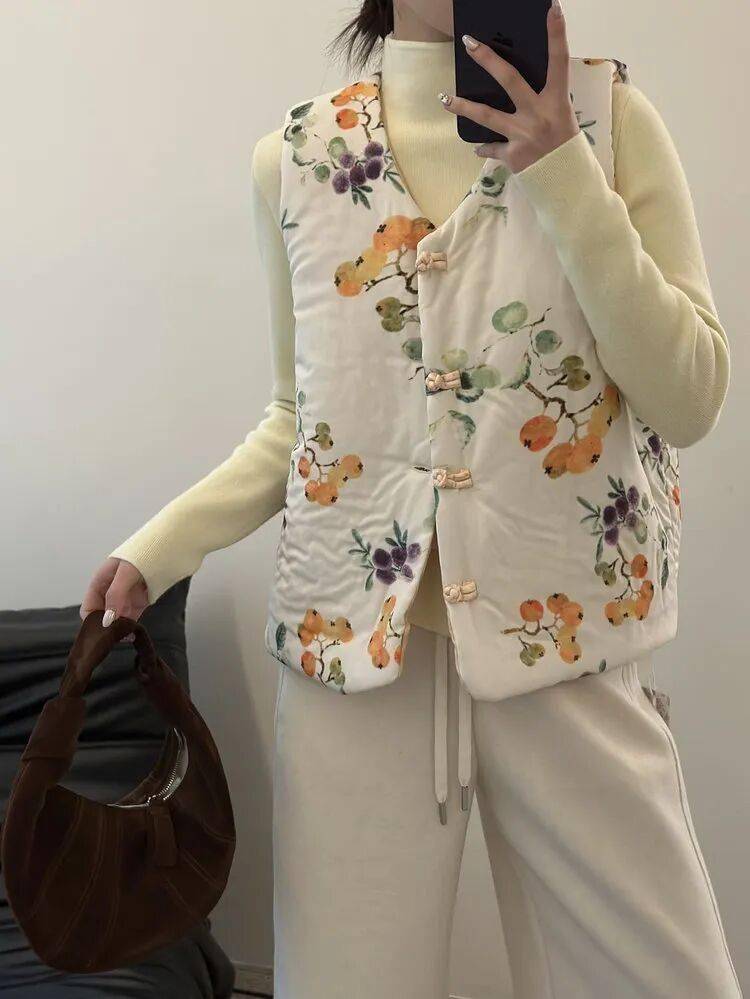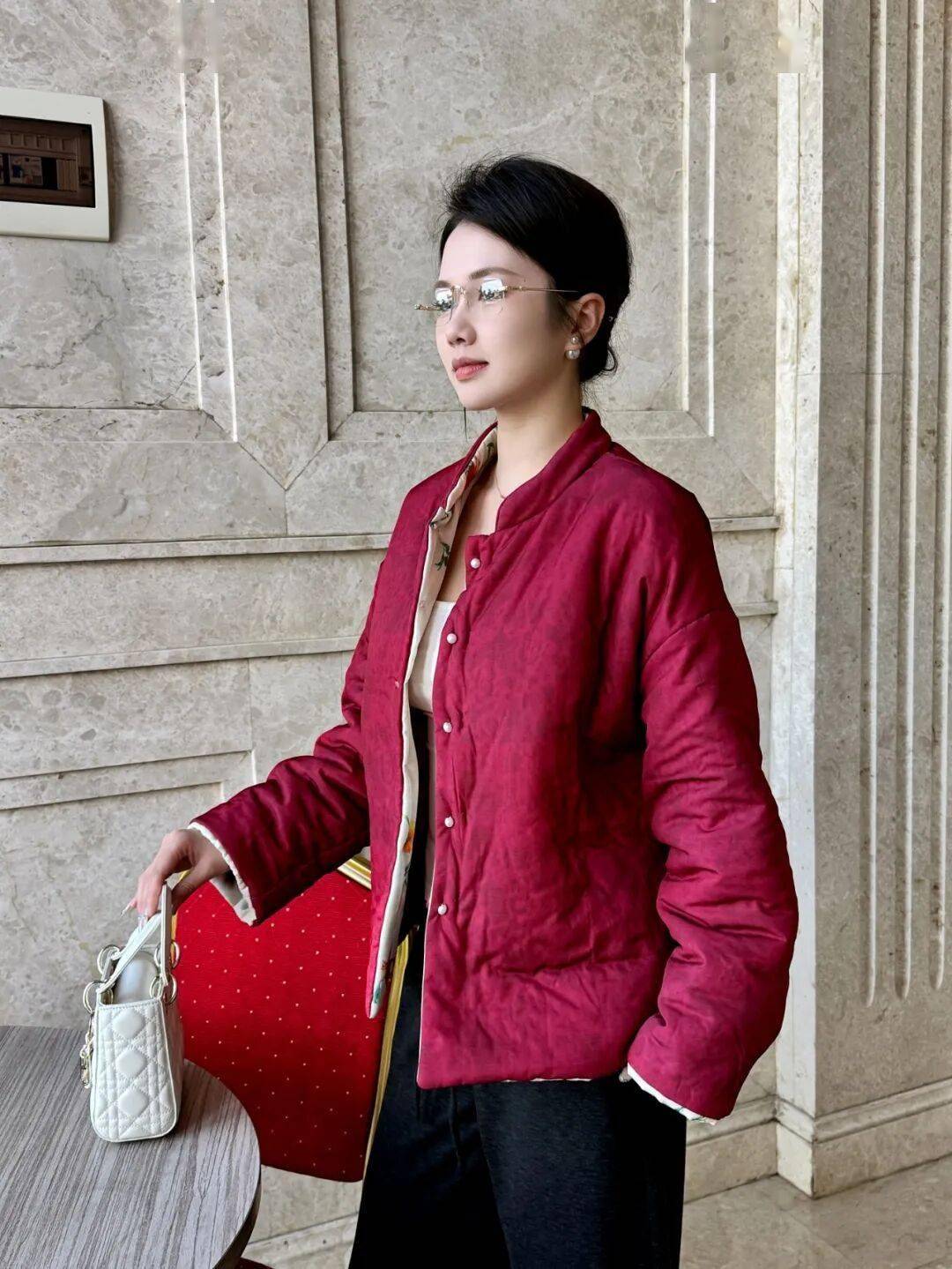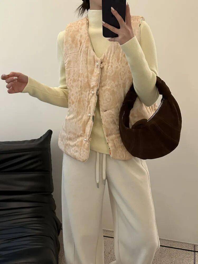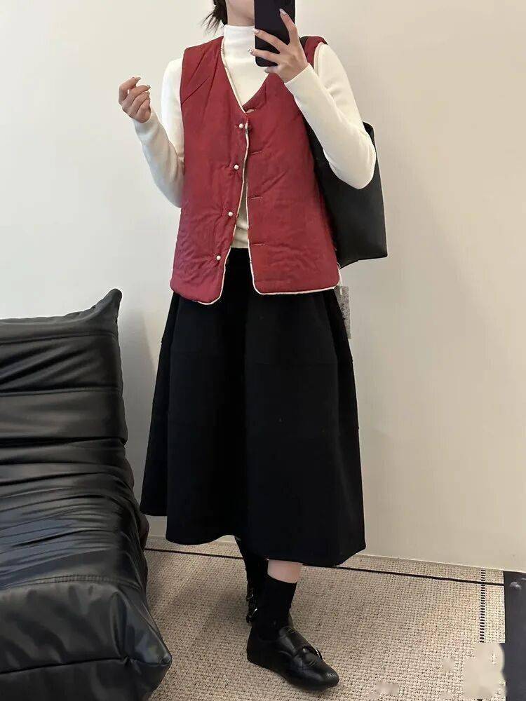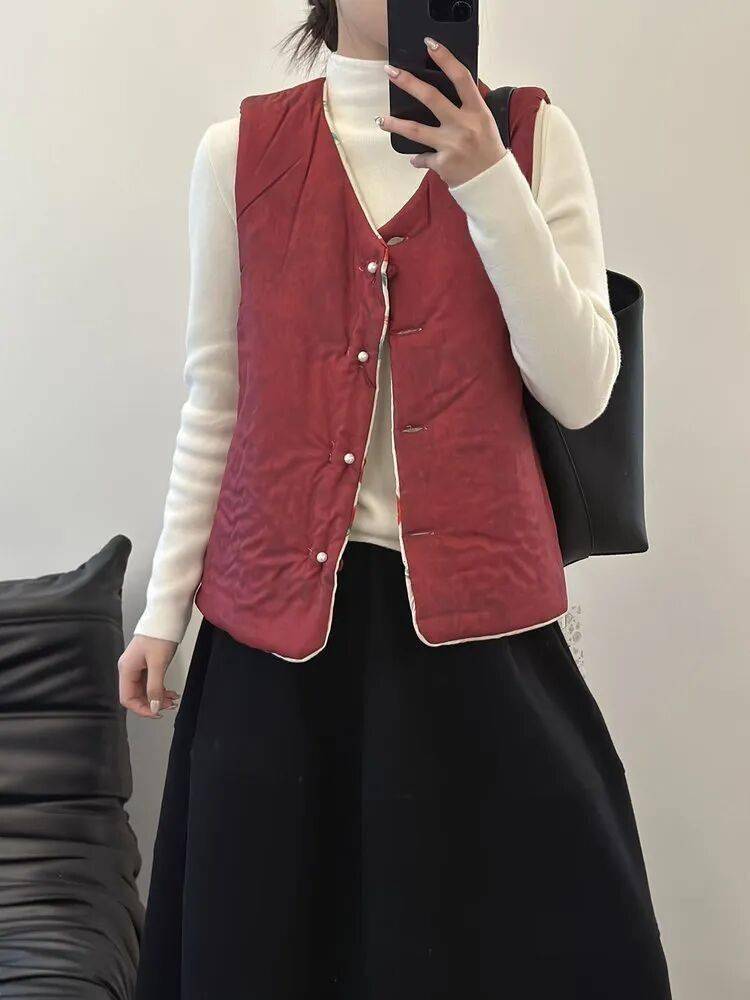 反面酒红暗纹,复古又显气色,盘扣细节也很中式,一件马甲,把年味和气质一起穿在身上。
