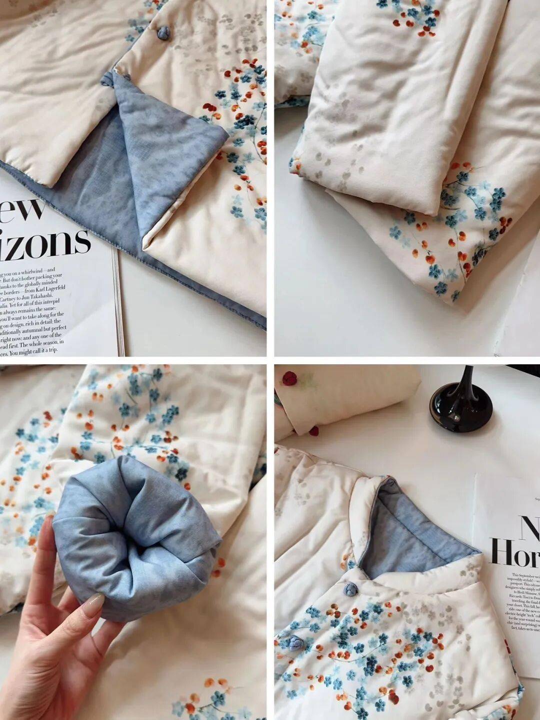 一面是国风印花,看着就温温柔柔,很有中式氛围;翻过来是暗纹,低调、干净、不花,但很显气质。