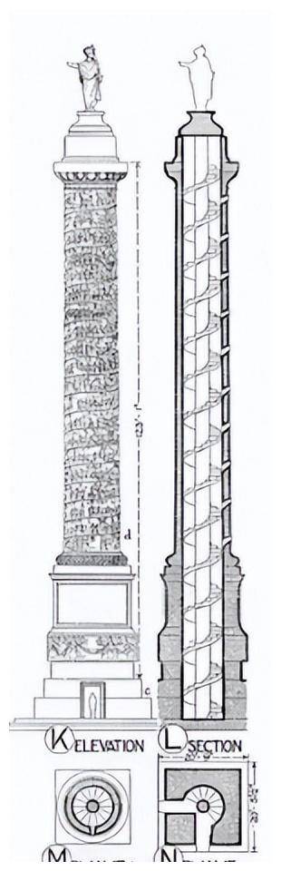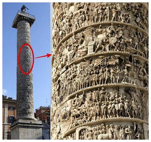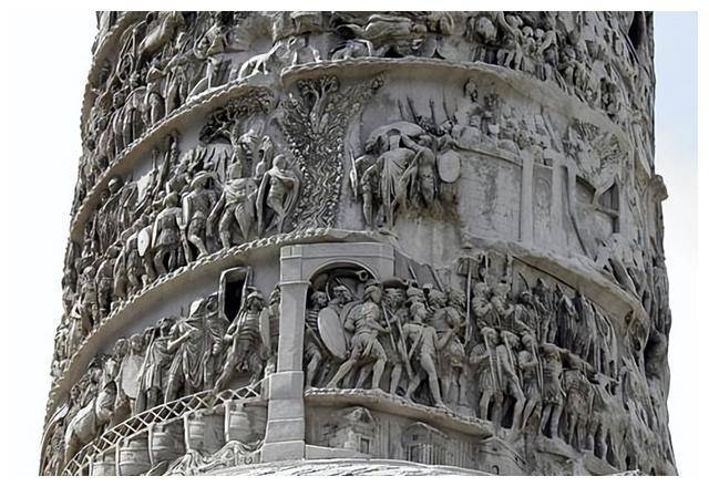 这座柱子是用多立克风格的柱头装饰的,表面有精致的浮雕,雕刻出了21个螺旋,每个螺旋的高度大约是130厘米。柱身轮廓几乎笔直,底部仅稍微宽了14厘米,雕刻上的浮雕非常迷人。这些精美的雕刻通过21个螺旋展示了马库斯·奥勒留所领导的两场重要军事战役。第一场战役是公元172年至173年与马科曼尼人的交战,第二场则是公元174年至175年与萨尔马提亚人之间的冲突。 柱身上浮雕的中间,胜利女神的形象出现在盾牌上,她的出现标志着这两场战役的分界。第一场战斗的雕刻从柱子的底部开始,展示了军队渡过多瑙河的场景。大部分浮雕内容集中在激烈的战斗场面,描绘了罗马军队在战场上的英勇表现。此外,雕刻中还穿插了一些有趣的背景画面,展示了皇帝在战斗中激励士兵的情形,以及罗马军队进行后勤支持和工程建设的画面。值得注意的是,其中有一幅浮雕刻画了军队穿越浮桥的场景,展示了战争中的后勤保障。