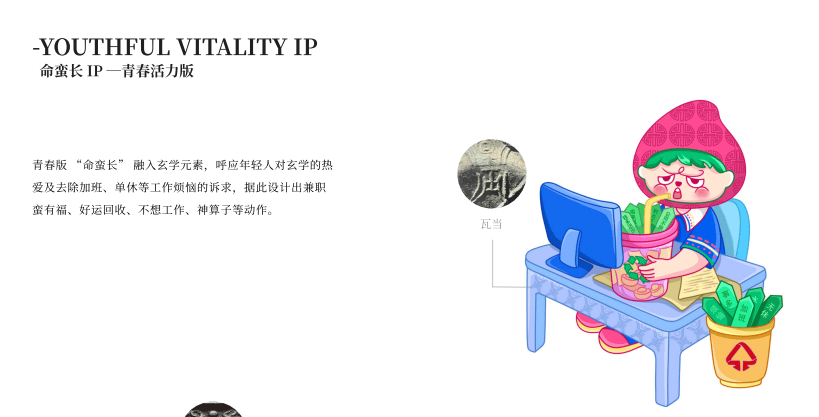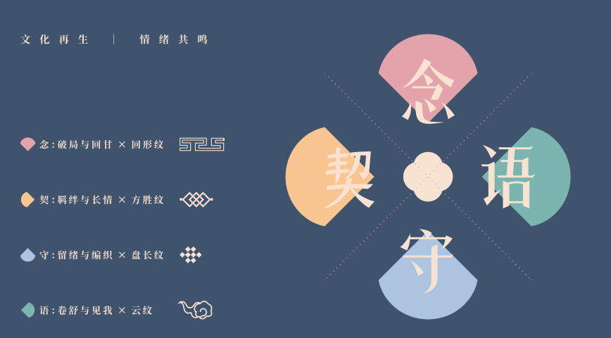于是,"四叶莲"纹样被重新设计,衍生出"念、契、语、守"四种情绪语言,打造成"情绪陪伴型"文创品牌。传统的福寿纹样则化身为"蛮有福""命蛮长"两个IP形象——一个是"社恐胖子",边吃边减肥的样子让人忍俊不禁;一个是"地头蛇",带着不服老的态度玩转玄学。