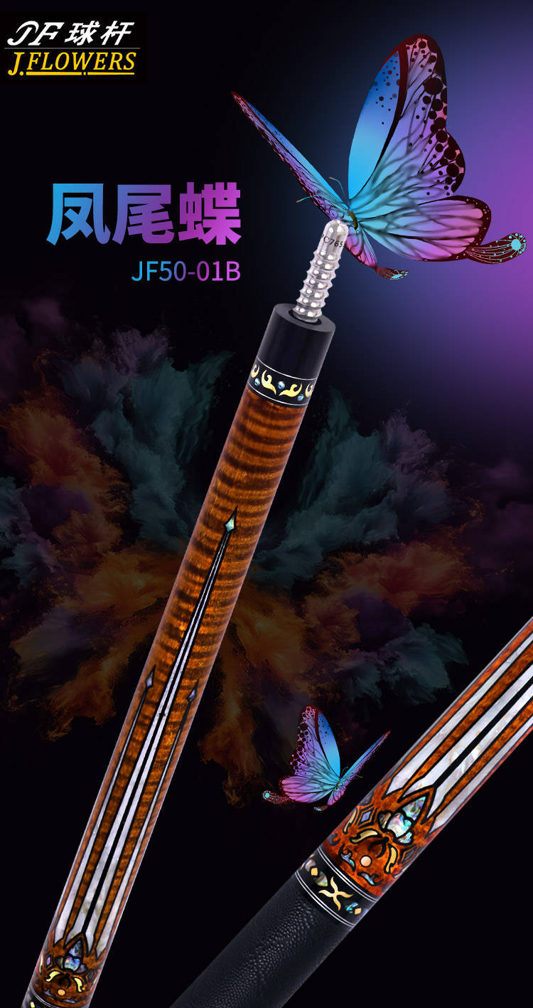 内测典范:冠军同款的工艺印证作为 JFLOWERS 签约球手,苏格兰美式台球领军人物杰森・肖(Jayson Shaw)的内测签名款颇具代表性。其球杆(IF-JS1F、JF-JS1WF 等系列),后把黑檀木镌刻专属签名,握把可选黑色蛇纹皮、白色蜥蜴纹等材质,将他的强悍风格融入细节。