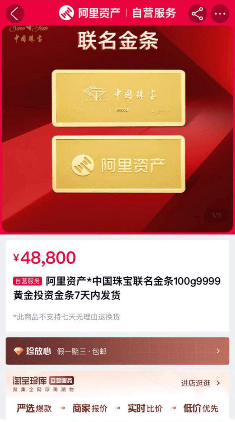 阿里资产和中国珠宝推出的联名款金条,以999.9足金为材质,含金量高达999.9‰,重量为100克,单价488元/克,每块金条售价48800 元。这款联名款投资金定价在490元/克,极具性价比!相较金饰品牌的克价,这个价格简直可以用“香饽饽”来形容。