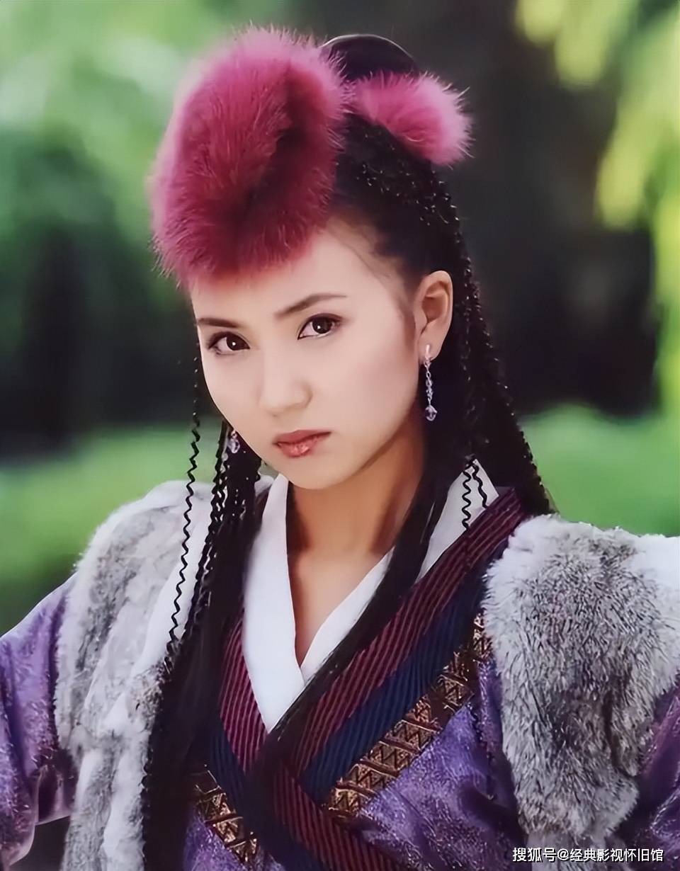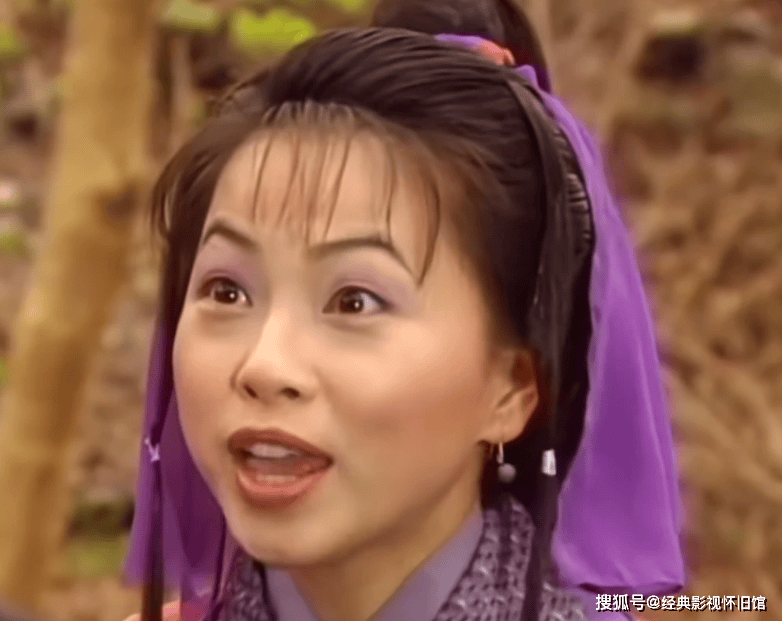 我们先来看97版刘玉翠的阿紫,虽然人有些阴狠,但有时候觉得她蛮可爱的,这个版本的阿紫,一出场就是身着紫色衣衫,后面,头上的头巾也是紫色的,眼影也是紫色的,耳环也成了紫色。