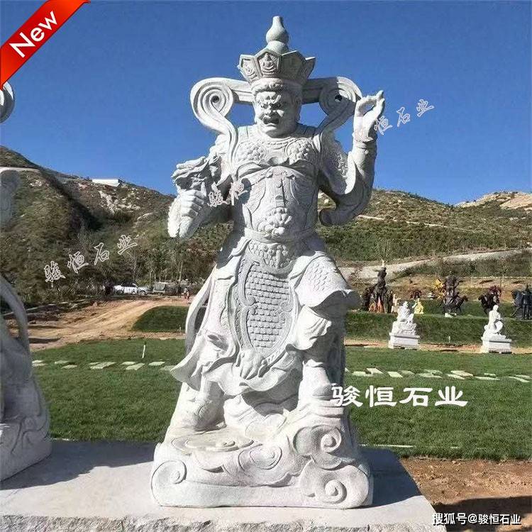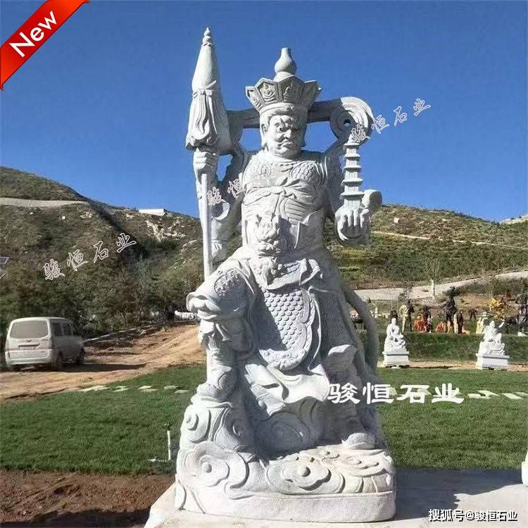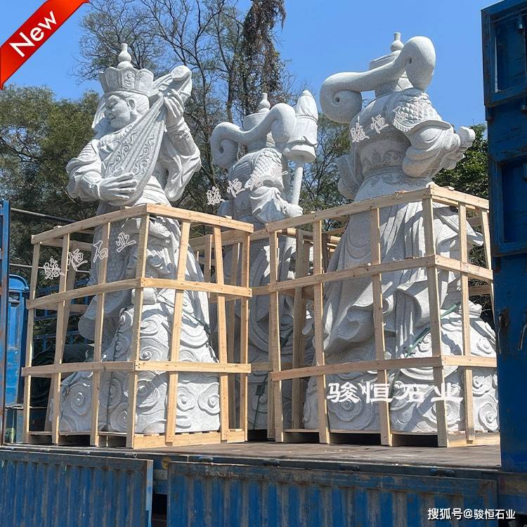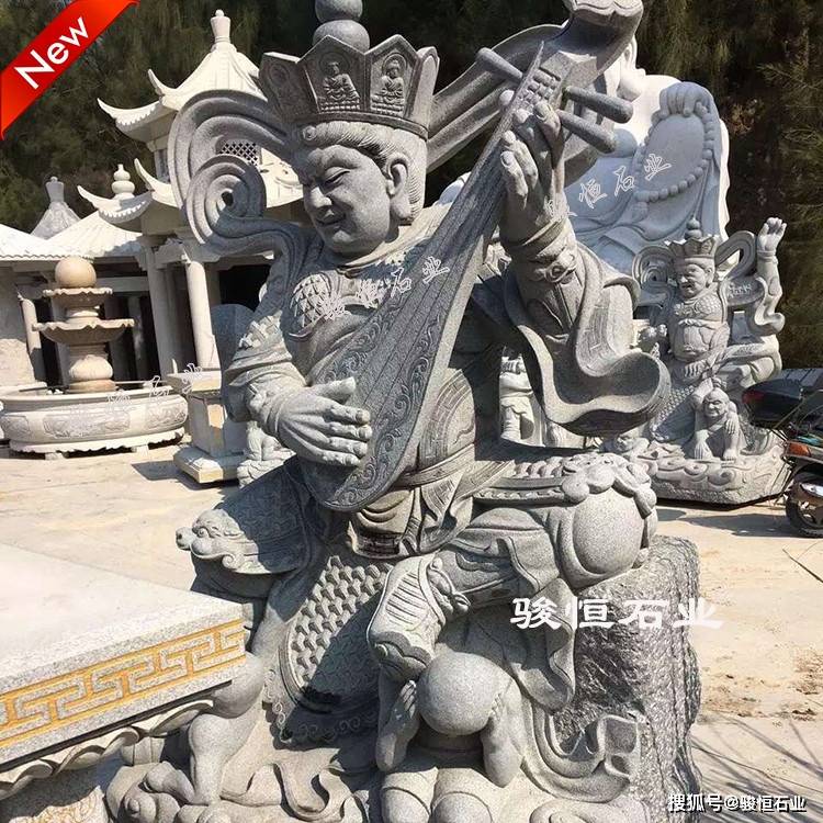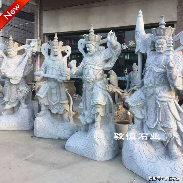 此类神像甄选优质天然石材雕琢,青石古朴厚重,花岗岩坚密耐腐,汉白玉莹润细腻,可按需定制选材,适配不同寺庙的建筑风格与传世需求。雕刻团队深耕寺庙古建石雕领域多年,严格遵循佛教典籍形制规范,以圆雕、透雕、浮雕等多重技法匠心打磨:持国天王怀抱琵琶,神情庄重,寓意以礼乐教化众生;增长天王手持宝剑,怒目威严,象征斩断一切烦恼障;广目天王手缠蛟龙,洞察八方,代表观照世间善恶;多闻天王手托宝伞,神态沉稳,寓意庇佑众生免受灾祸。