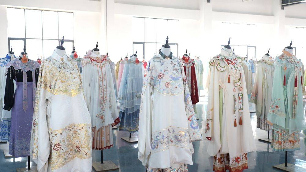 在当地原创汉服品牌洛如嫣的展厅里,设计师向记者展示了一款名为“百鸟朝凤”的明制汉服。它在制作过程中采用了对花工艺等技术,保证了图案的美观和完整性,提升了服饰的精致度与艺术价值。