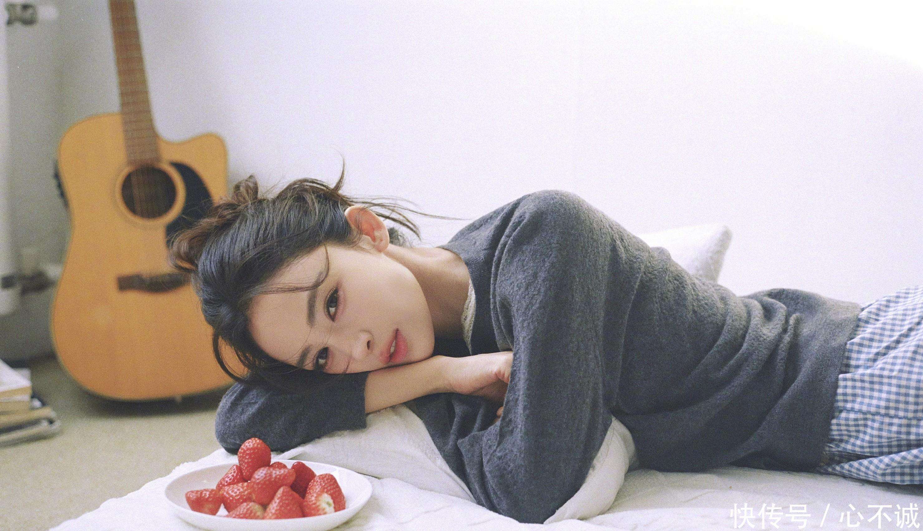 她的发型和配饰选择也为松弛感加分不少。随意挽起的丸子头上有几缕碎发,显得非常自然,没有刻意打理的痕迹,却又透出一种灵动和轻松的气息。偶尔戴上的黑框眼镜增添了几分文艺知性的气质,与弹吉他的场景相结合,整个氛围感顿时被拉满。她并没有佩戴过多的首饰,而是通过穿搭本身的质感来撑起整个造型,这样的简约反而更能凸显她的颜值和气质。