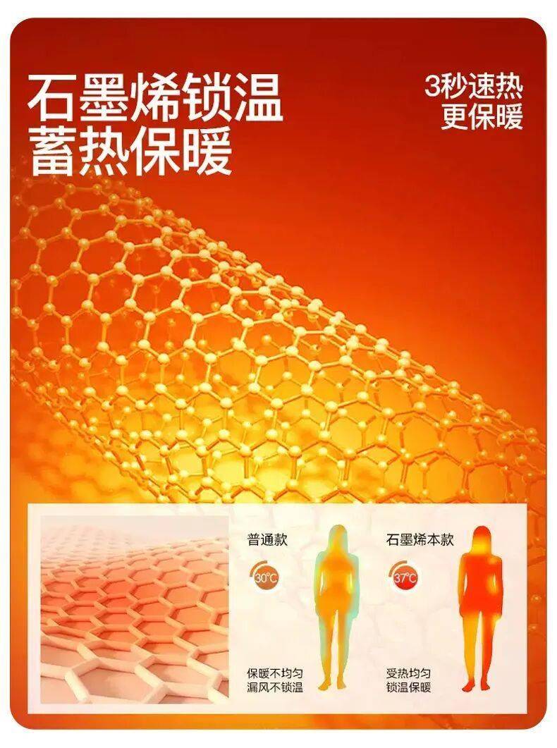 石墨烯3秒速热,释放的红外光波接近人体波长,易被皮肤吸收,温暖更持久。