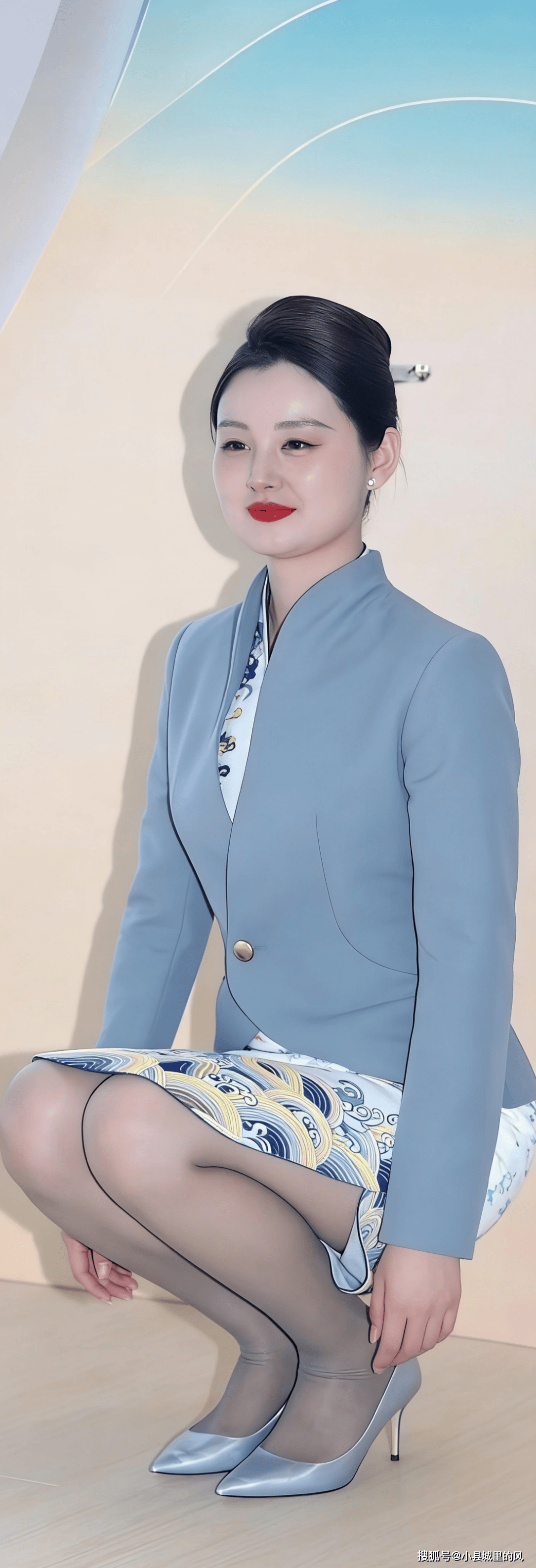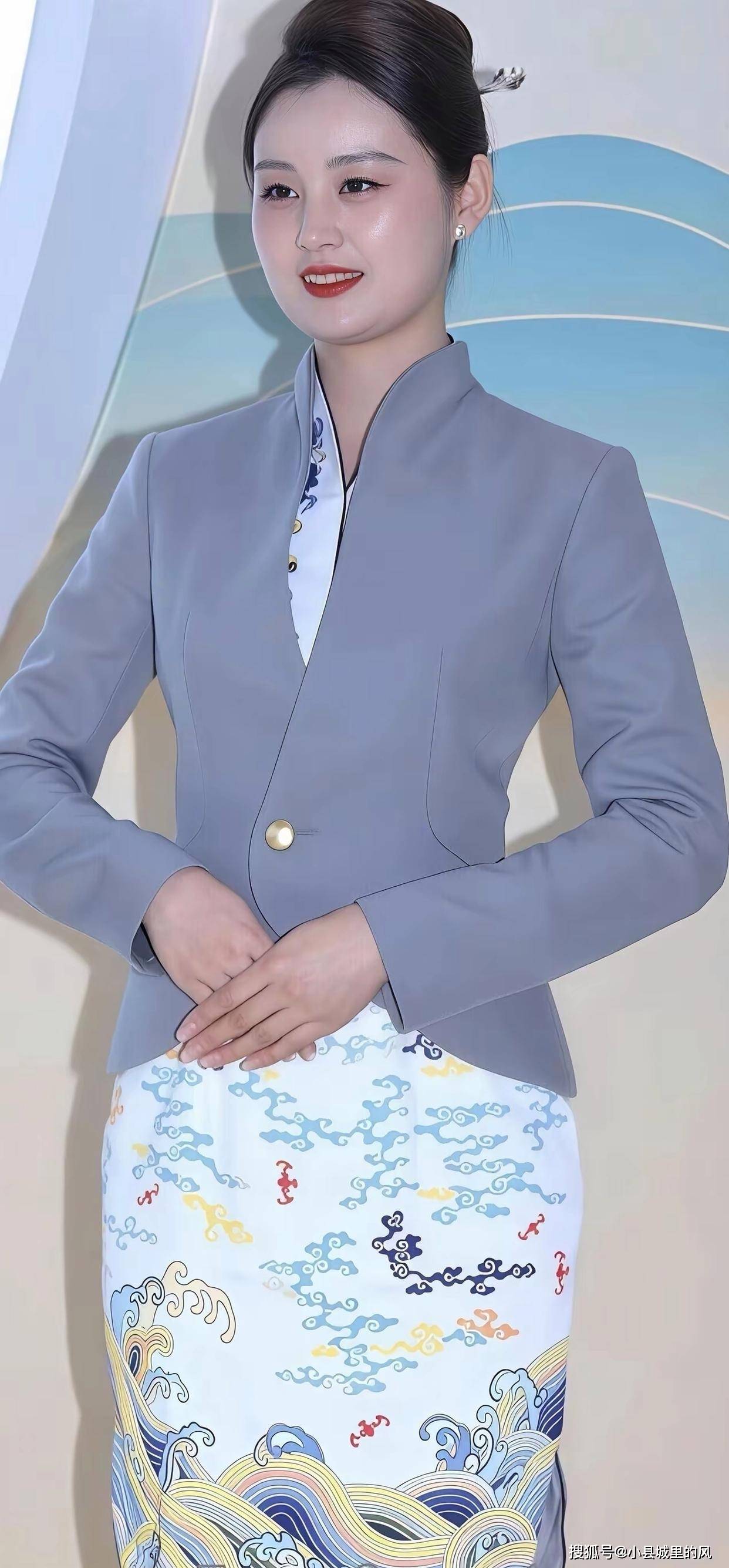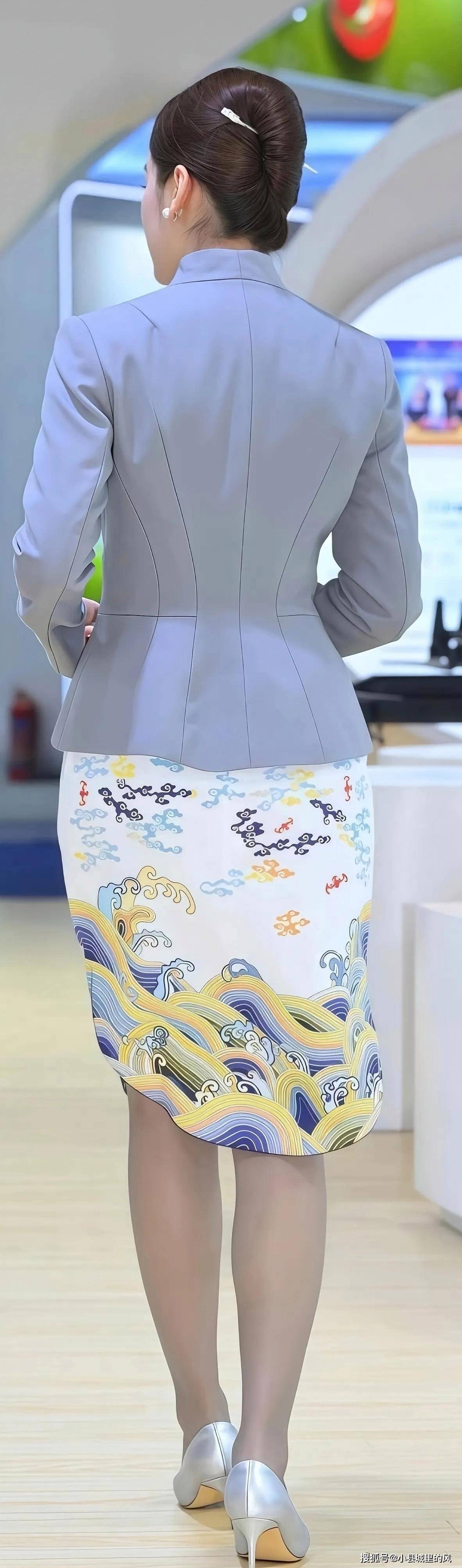 下装的包臀半身裙是设计亮点,白底搭配蓝黄相间的海浪祥云纹样,国风元素浓郁且色彩与上衣的雾蓝色相呼应,视觉上和谐统一。包臀的版型贴合腿部线条,长度及膝的设计兼顾了职场的端庄与女性的柔美,纹样的渐变排布让裙装更具流动感,打破了传统职业裙装的单调。