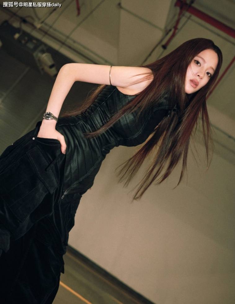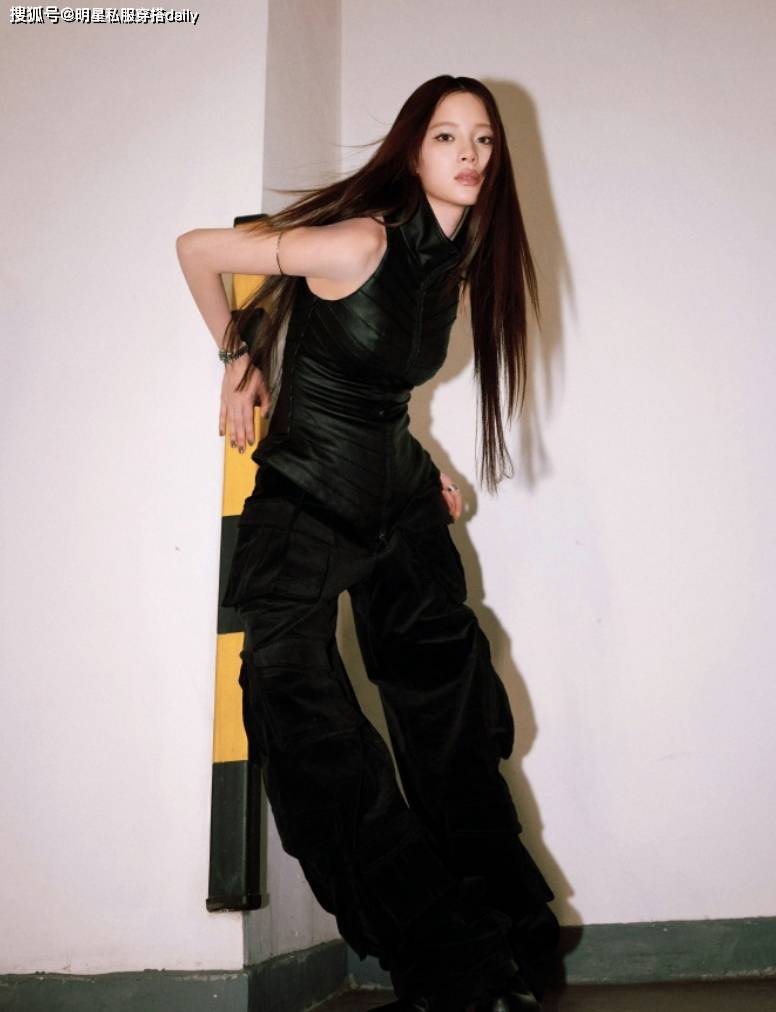 下半身搭配的黑色工装阔腿裤,则增添了几分不羁与洒脱,时髦又洋气。这套穿搭让欧阳娜娜看起来既有摇滚女郎的酷劲,又不失女性的优雅与魅力,完美诠释了时尚的多面性。
