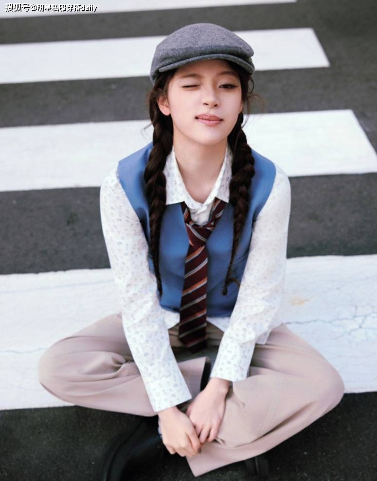 在这套穿搭中,欧阳娜娜以一顶报童帽搭配两个麻花辫,瞬间将复古文艺的气息扑面而来。蓝色马甲背心作为外搭,既保暖又不失时尚感,内搭一件白色碎花衬衫,清新脱俗,仿佛春日里的一抹温柔。