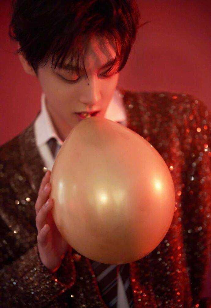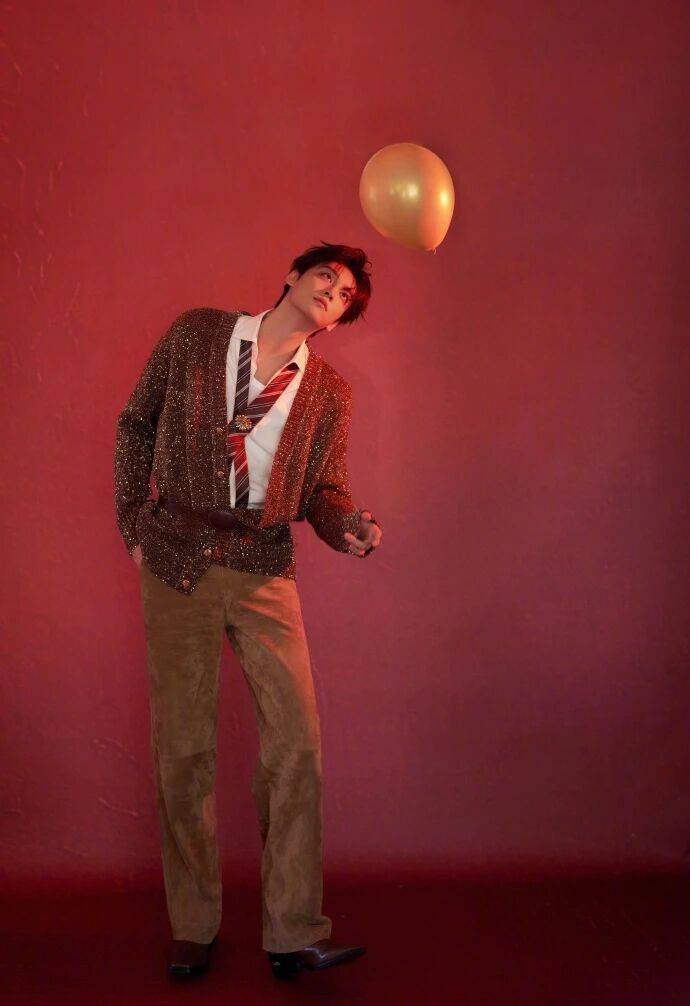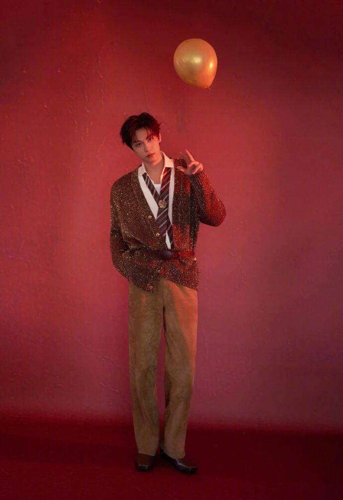 红背景是新年的浓郁底色,衬得细闪针织的 “星光” 更亮;金色气球是新年的鲜活点缀,和细闪的光泽呼应,让整个画面既有新年的暖意,又有星光的轻盈。他和气球的互动没有刻意摆拍,指尖碰着气球、侧身倚着的姿态,全是少年的自在,把 “新年新造型” 变成了 “星光下的日常松弛”。
